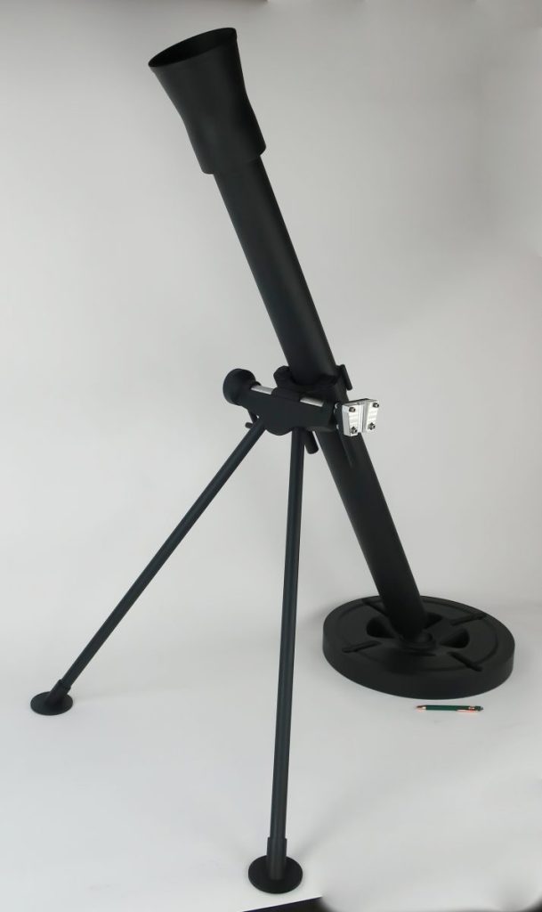 This full scale 81mm mortar model was designed to come apart in 6 pcs to make it easy to transport to customer events and trade shows. The pieces include 1) 2pcs PVC tube that join in the middle, 2) a center bracket that includes the aluminum machined optics dovetail, aluminum cross-pin, and 1/4″ aluminum bracket that holds it all together 3) 2 steel legs and 4) an 18″ 3D printed base.