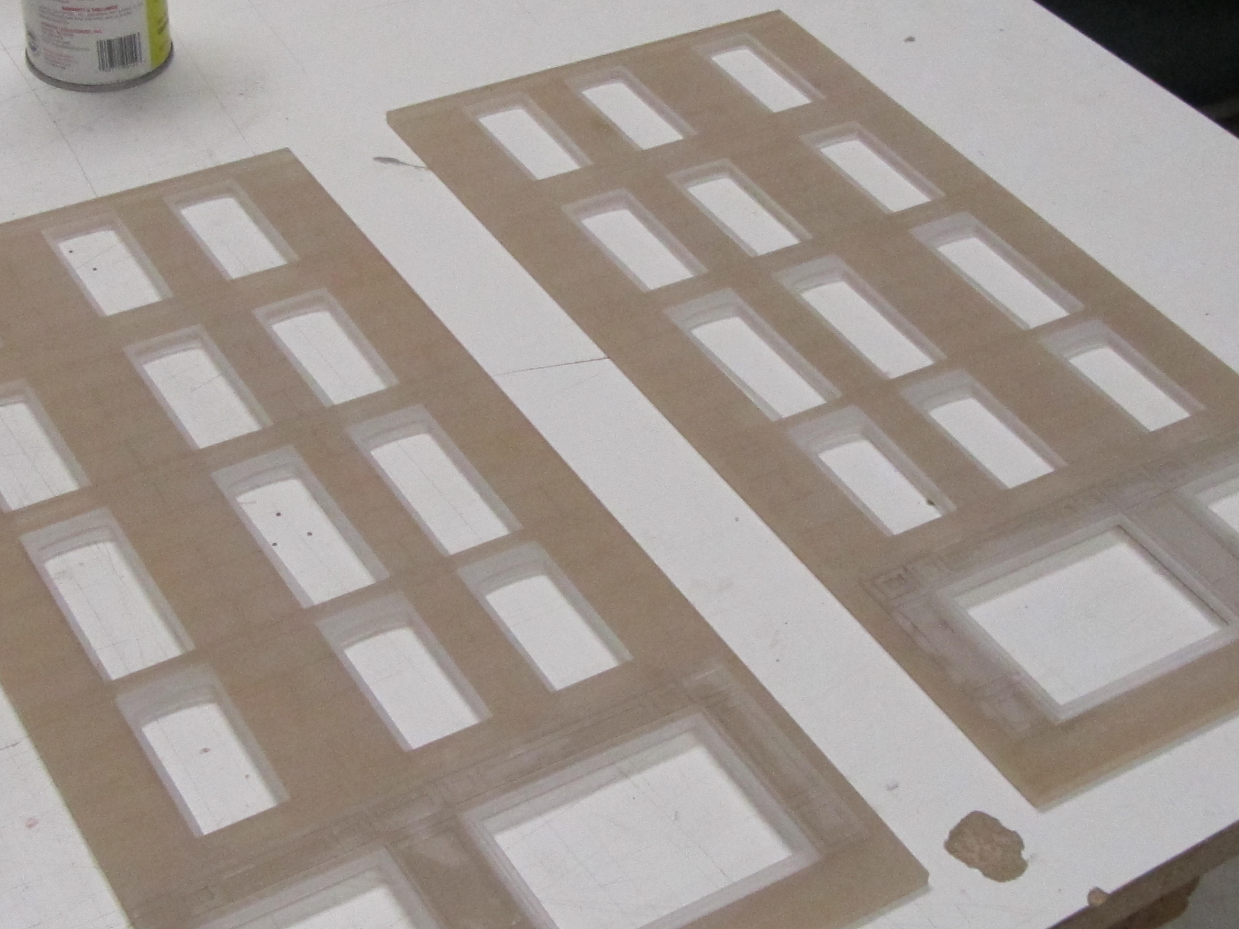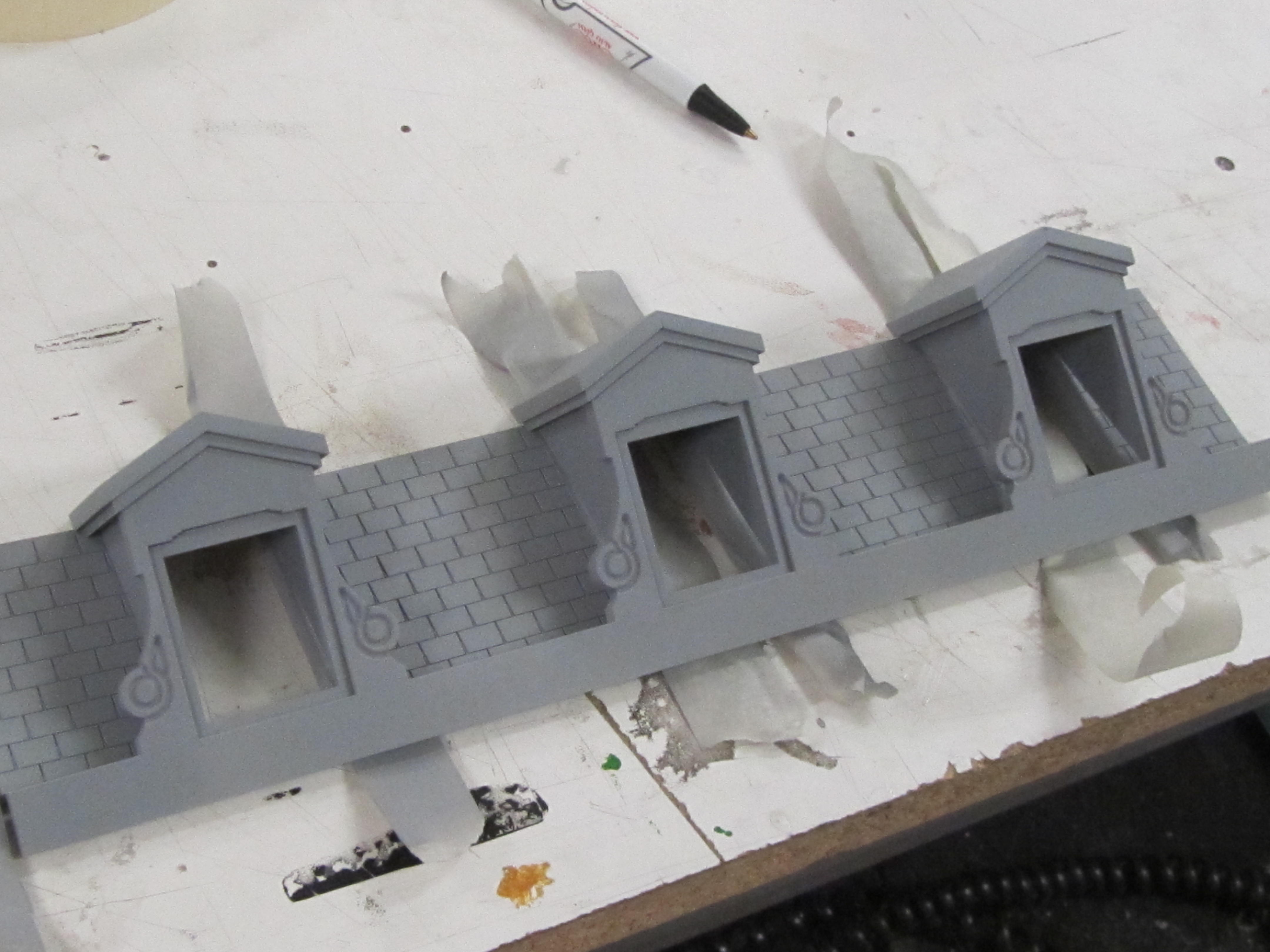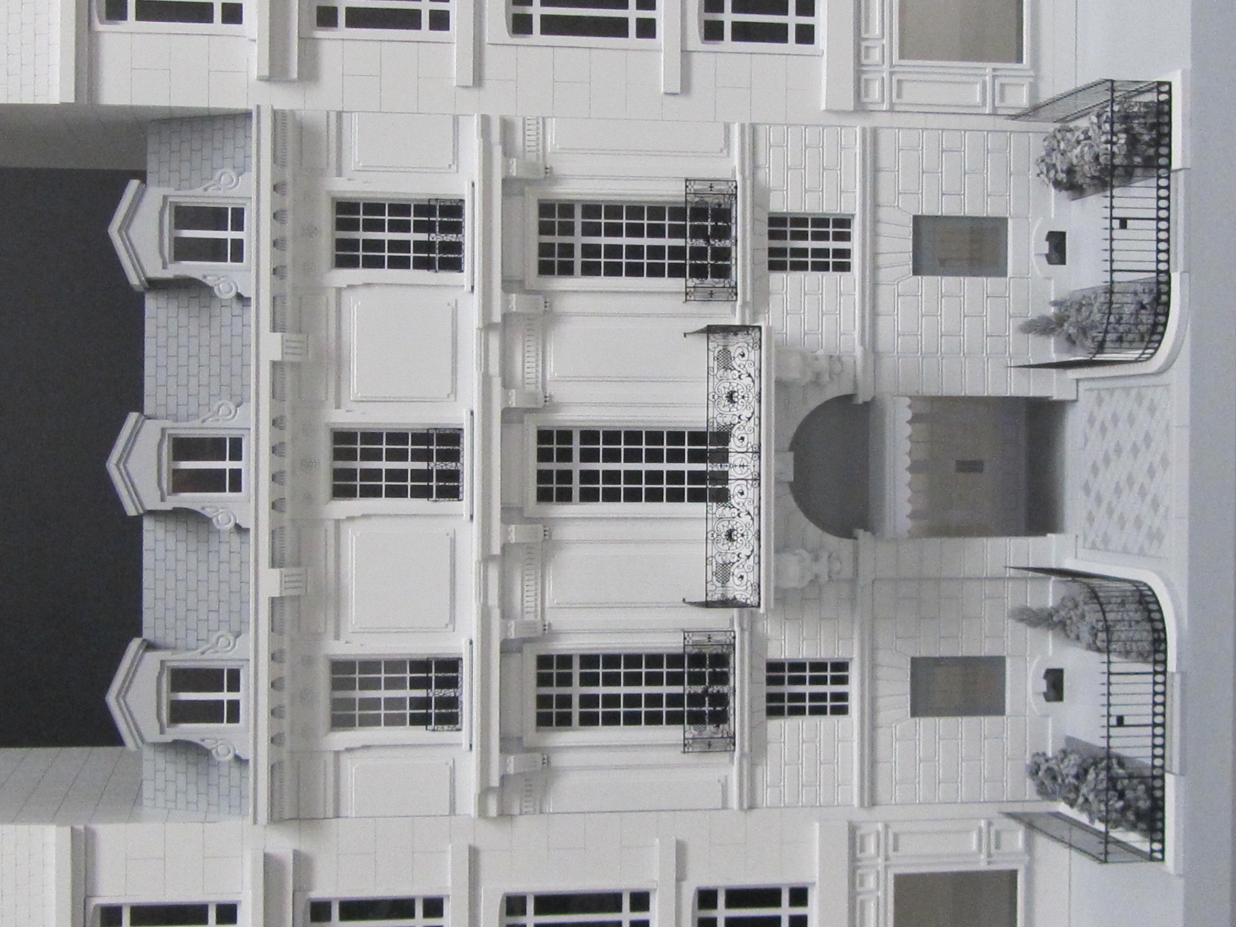 The walls were laser cut plastic. Brass etched details around the windows added visual appeal. Custom created trees were added for further effect in this architectural prop model.