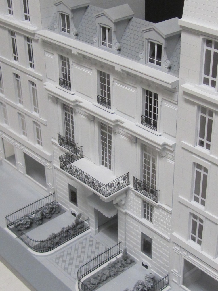 The walls of the building were made of laser cut plastic. It featured intricate railings around the windows, created by brass etching. Custom foliage was added to complete the look of this architectural prop model.