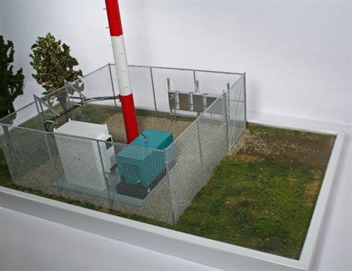 This is a 1/14th scale (22" x 40") cell tower model and support equipment for trade show display. Everything on this cell tower model (except the trees) was custom made by our talented in-house model makers.