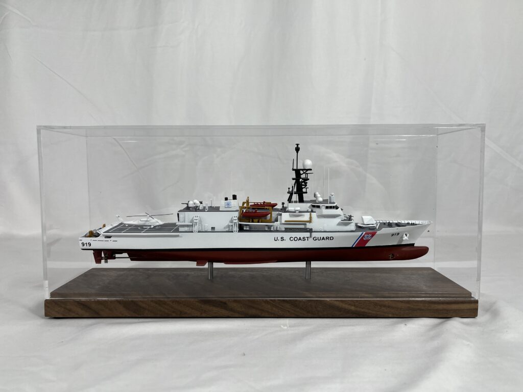 KiwiMill built 10 of these small Coast Guard Cutter desktop models. Each Coast Guard model was mounted on a Walnut base and included a clear dust cover.