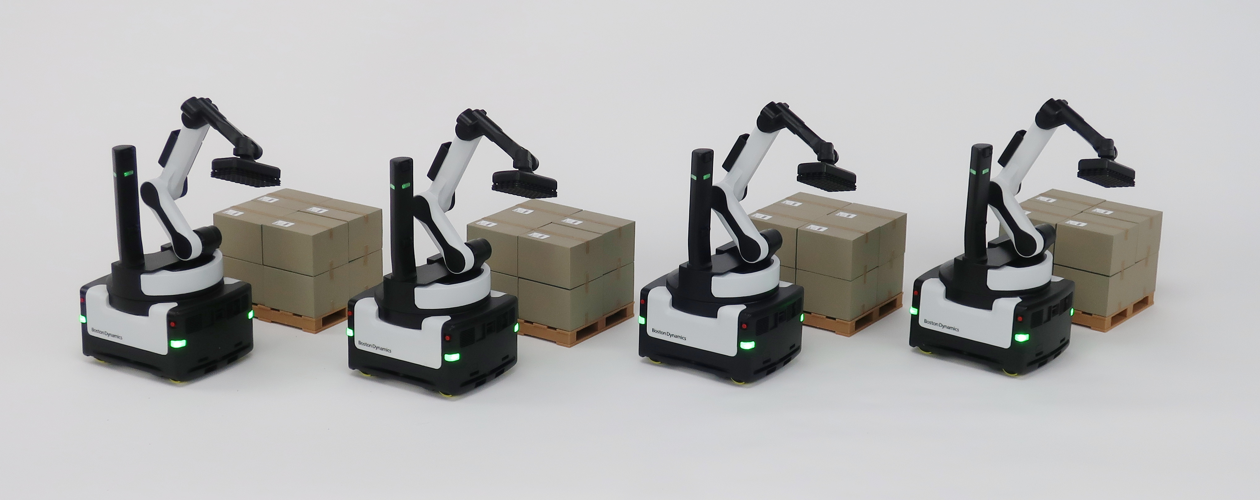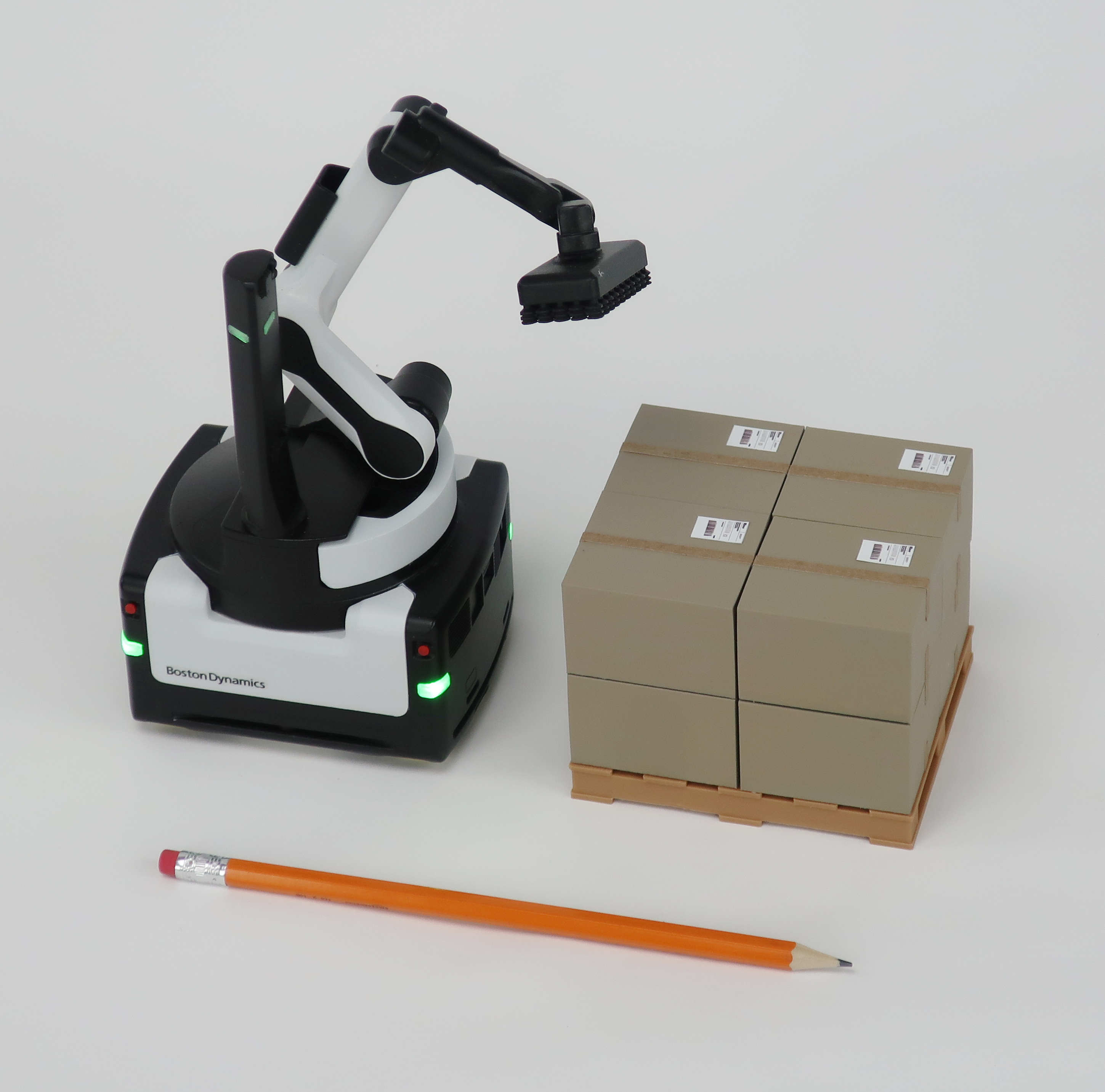 To illustrate real-world use, the model features a skid with stacked boxes, showing how the robot functions within a production environment. This small-scale scene helps customers quickly understand the robot’s purpose and value in palletizing applications.