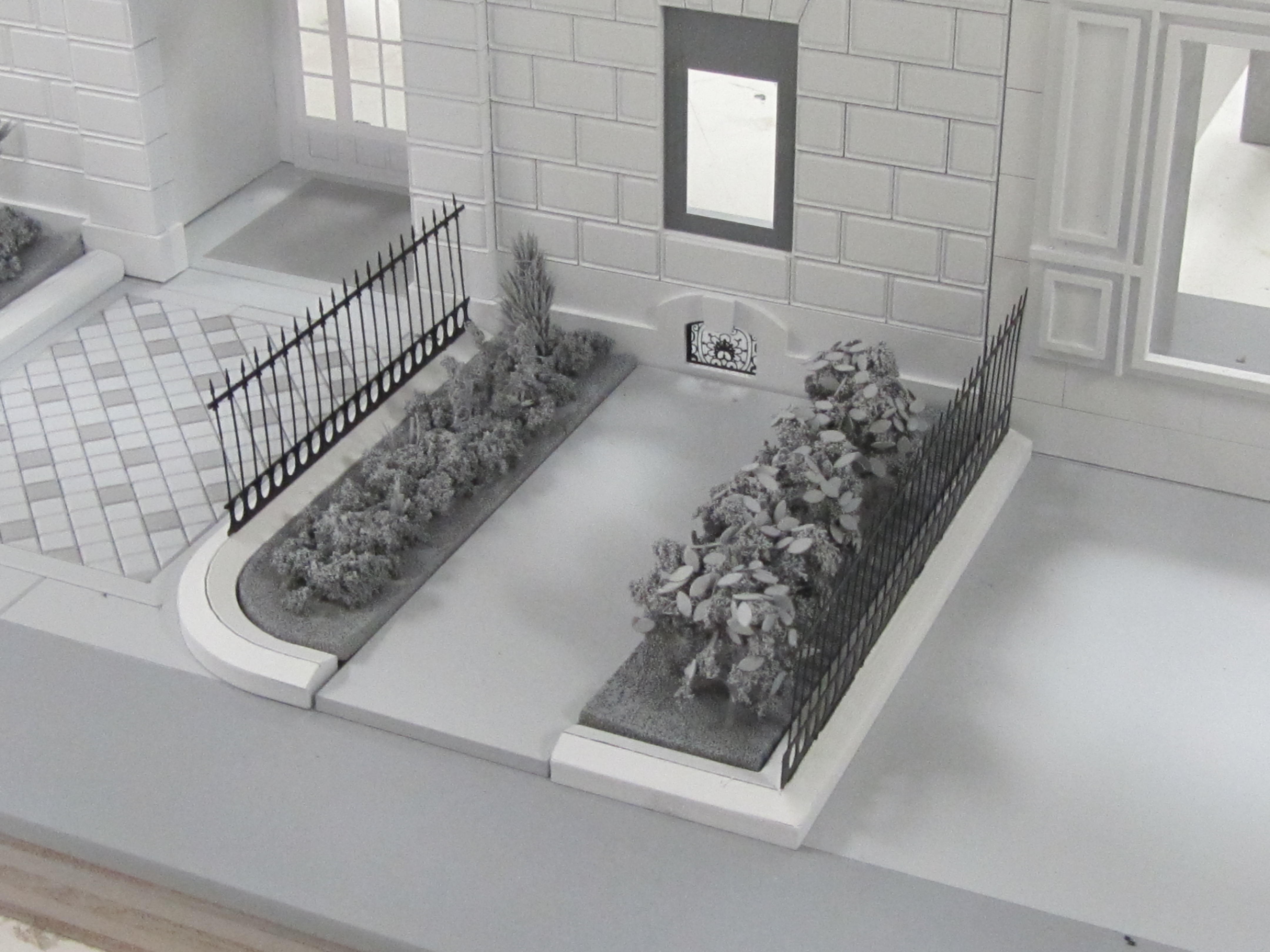 The walls of the building were made of laser cut plastic. The intricate railings around the windows were created by brass etching. Custom foliage was added to complete the look of this photo prop model.