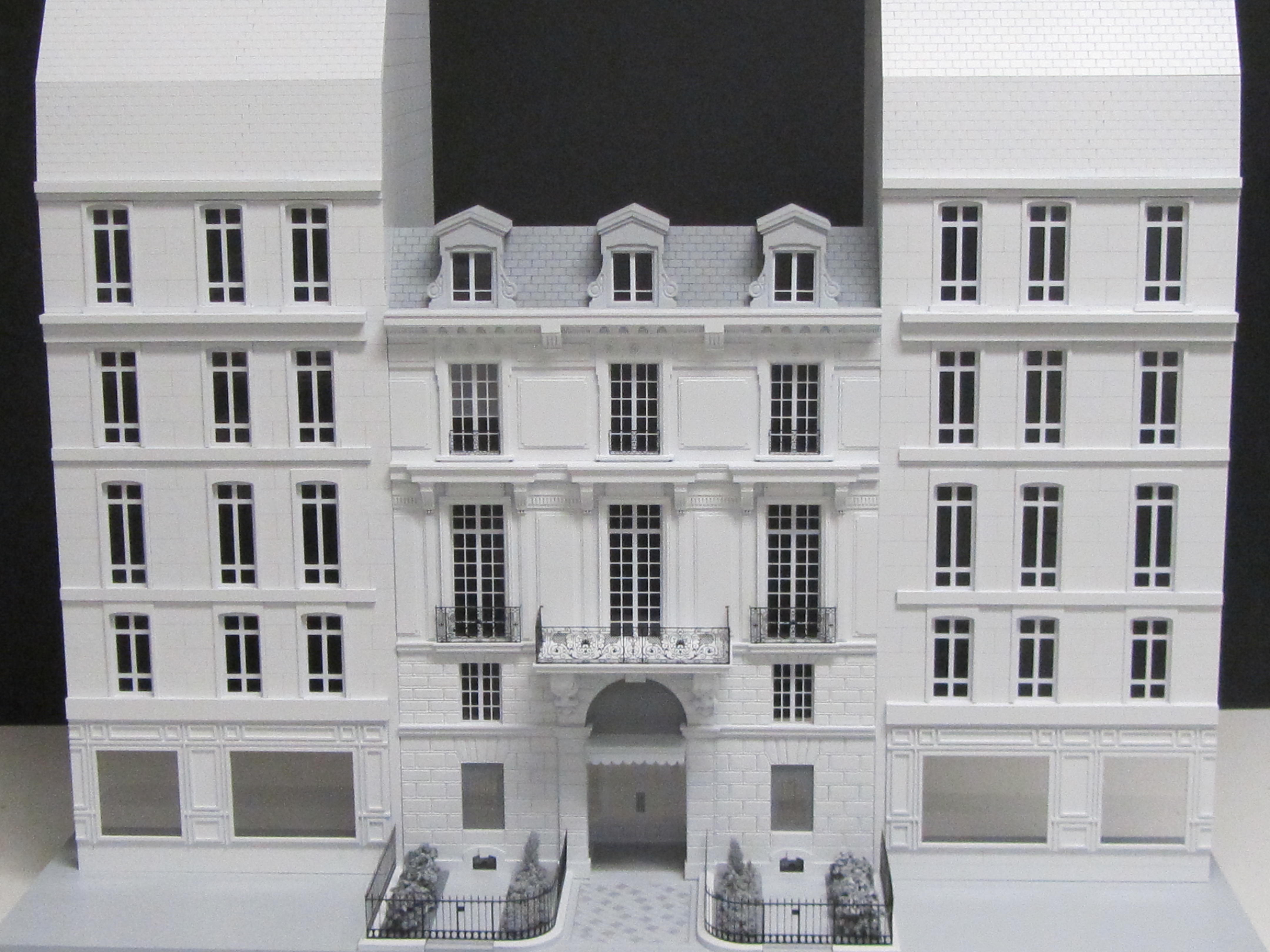 The model involved a facade of the House of Dior, Paris. It included the entrance way, windows, railings and stylized trees. The photo prop had some 3D aspects to it, as the perfume bottles rested on the balconies of the building.