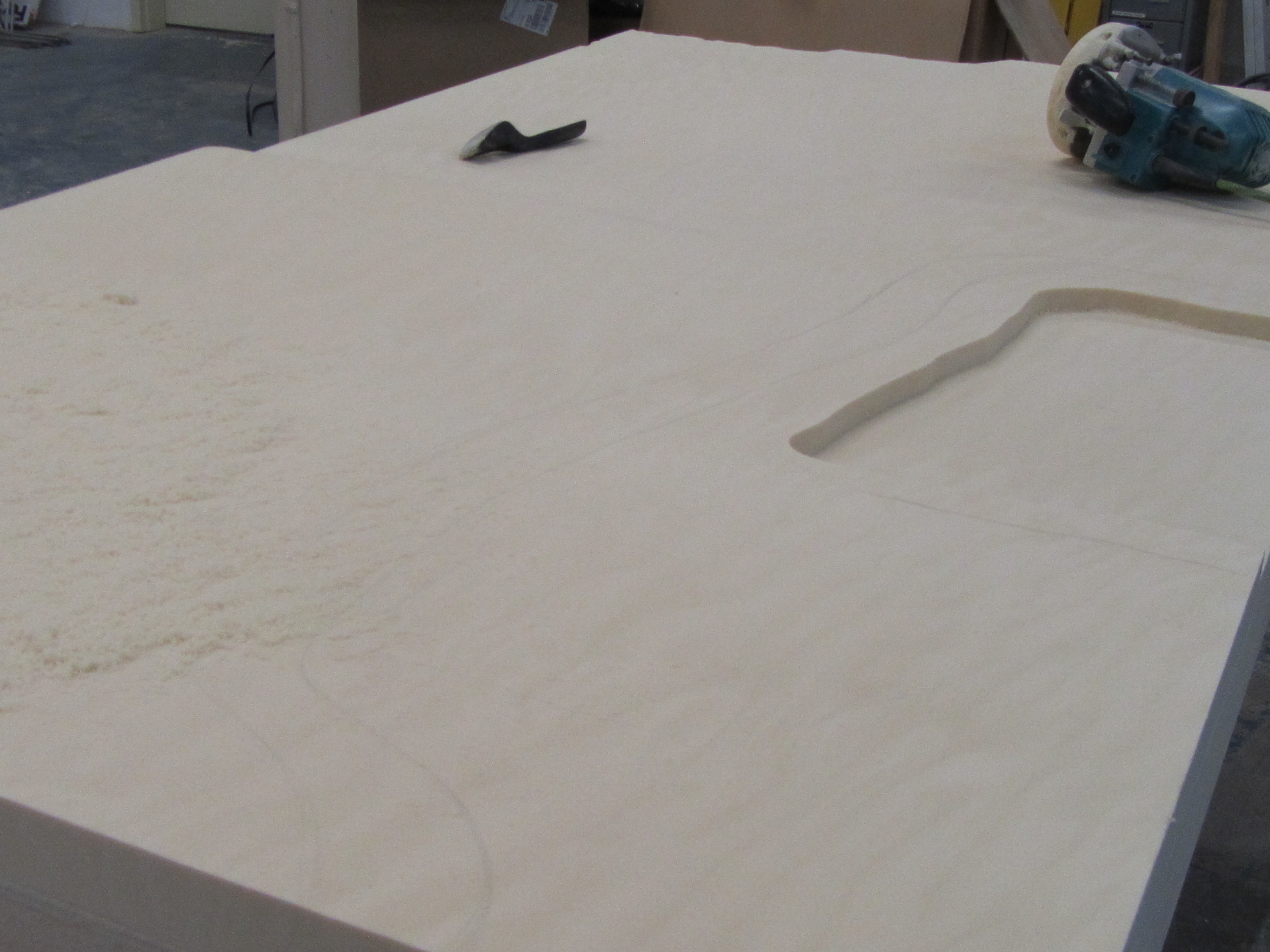 It's time for flocking our latest architectural model. What is flock, you say? It's the process by which our model makers add the ground landscaping to the base of an architectural model. The base starts out as a beige colored, hand-carved & sanded piece of foam.