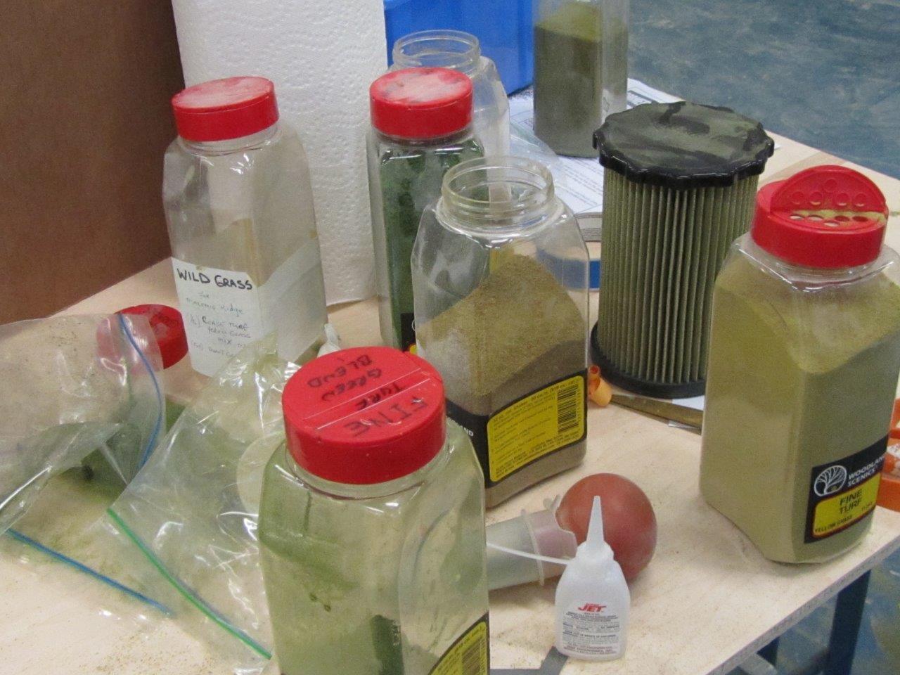Flocking comes in various natural shades of green, brown and yellow and can be found at most specialty hobby model shops. Glue is applied to the surface of the foam base and then various shades are sprinkled on. The excess is then swept or vacuumed off.