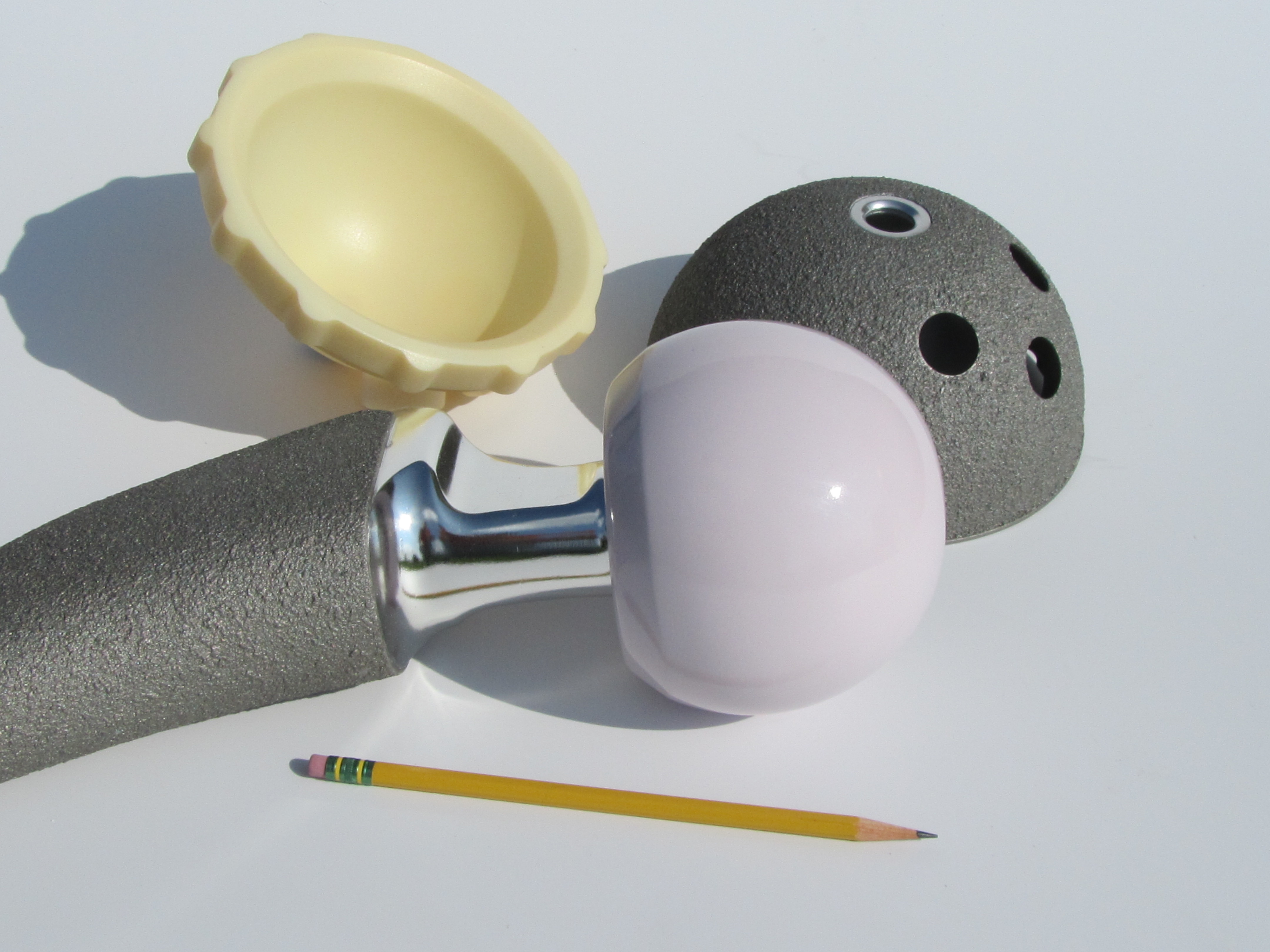This hip implant model is 3 1/2 x the size of the real implant. This human friendly scale shows off the design and features of the model to potential customers at trade shows.
