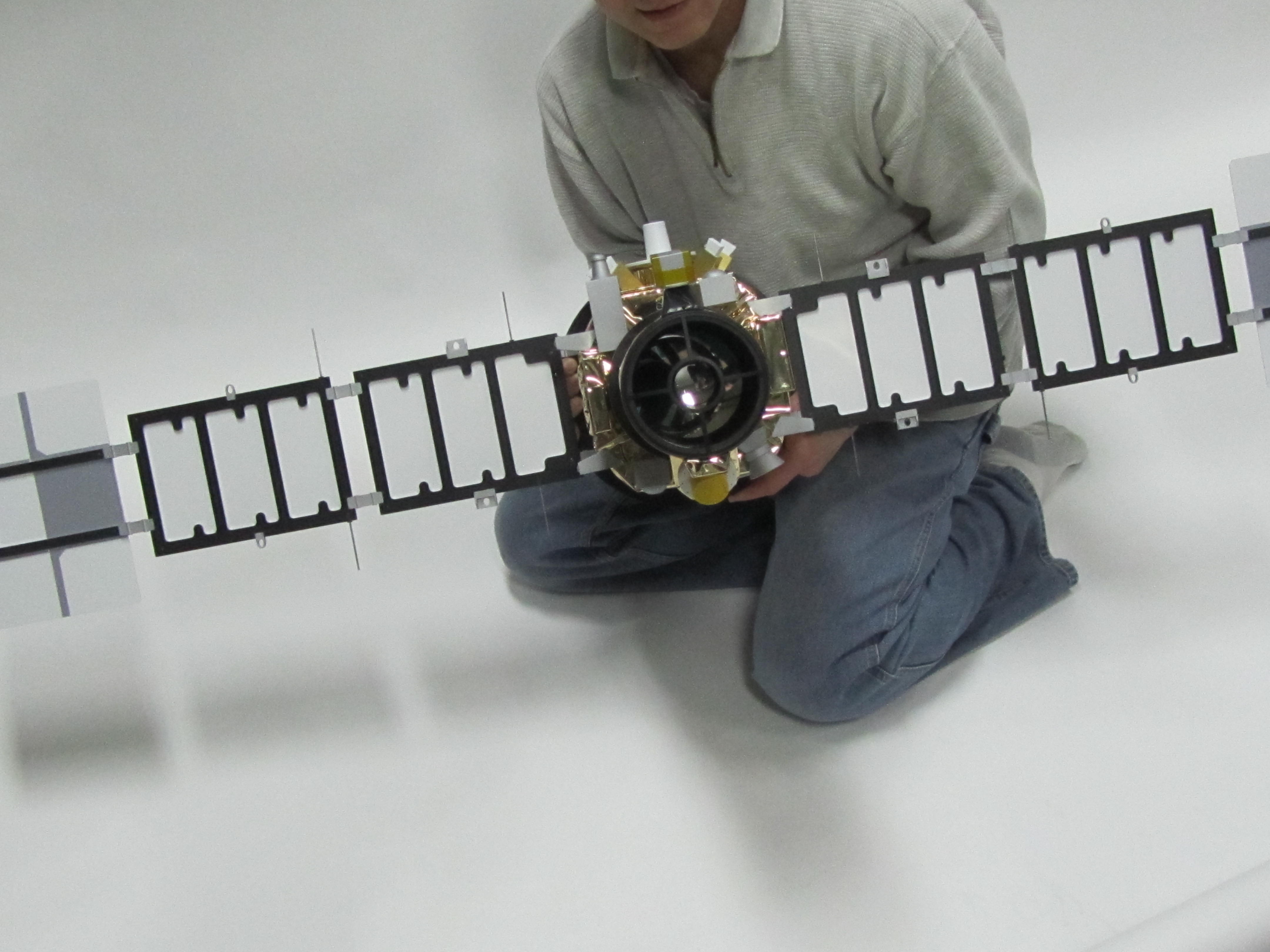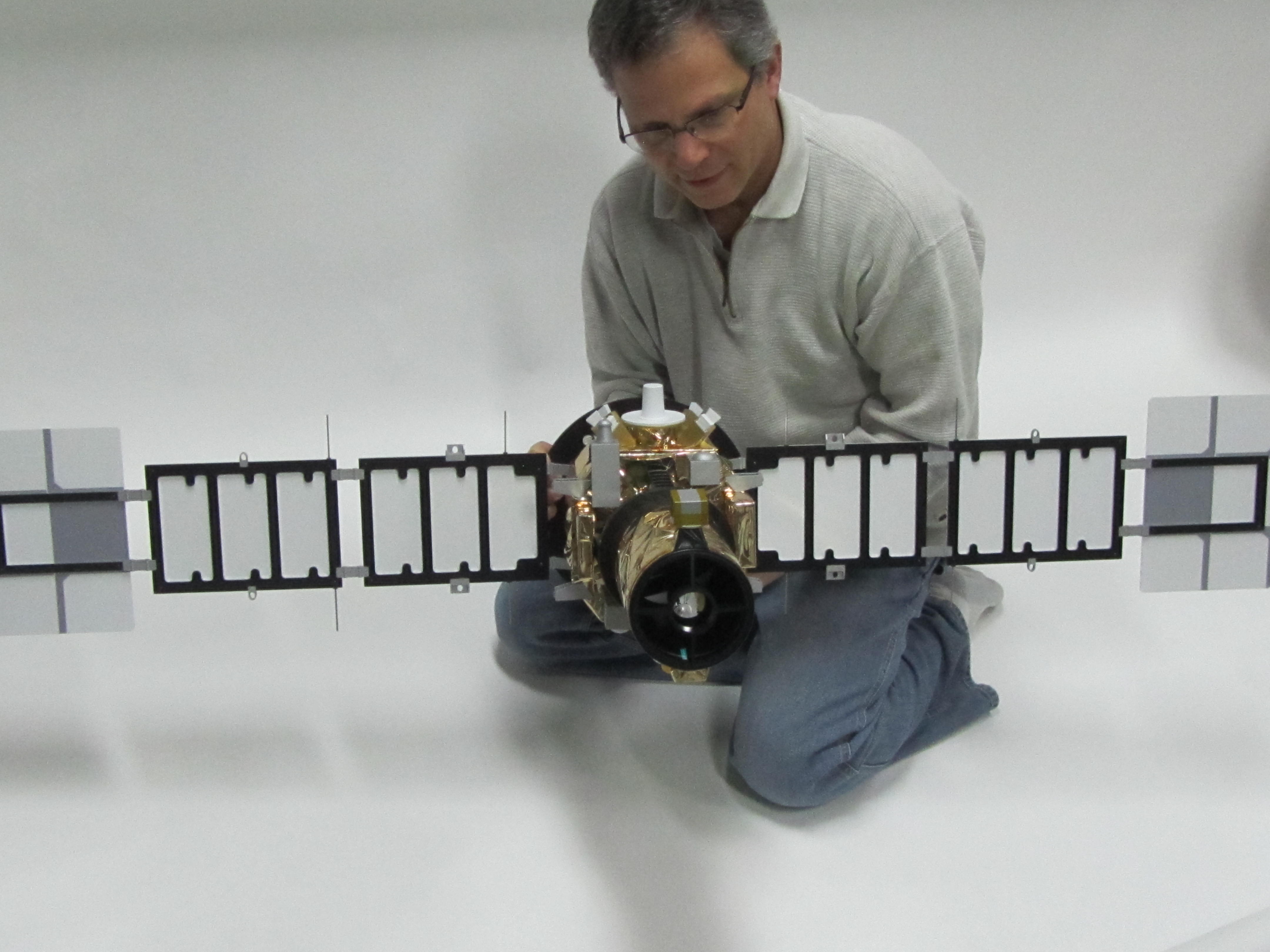 The wingspan of the satellite model was approximately 4 feet. The solar array frames were laser cut from aluminum for strength. The solar panels were made from back painted acrylic.