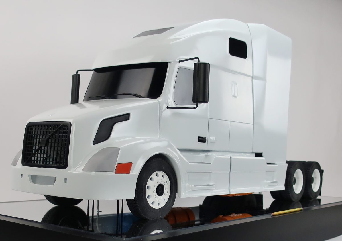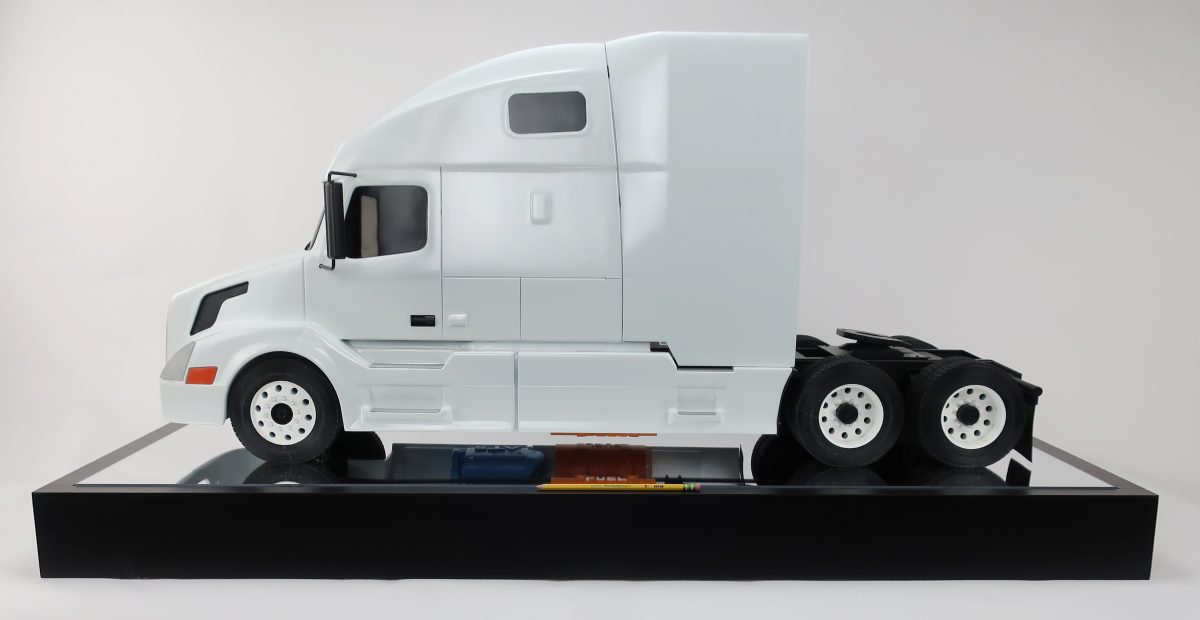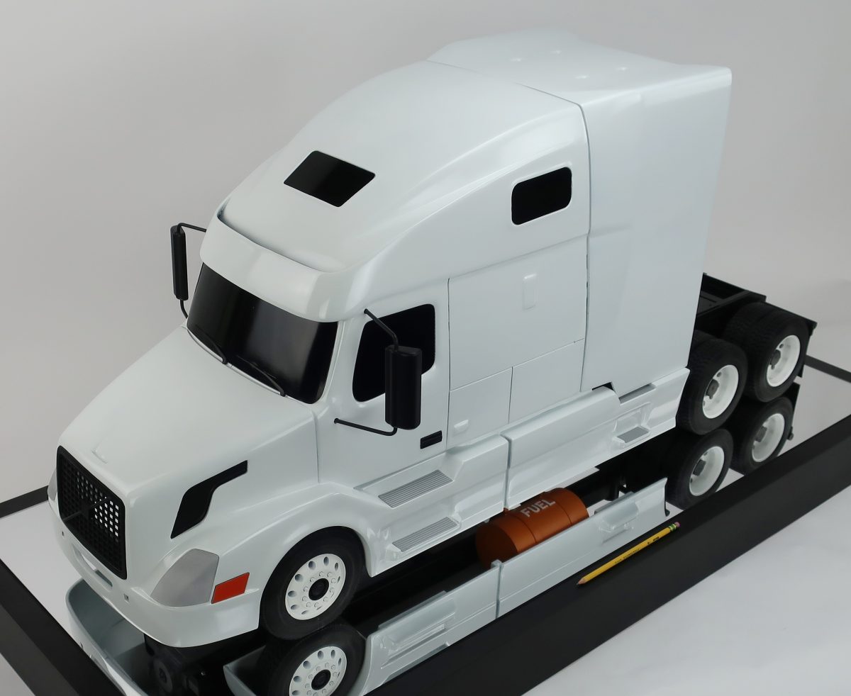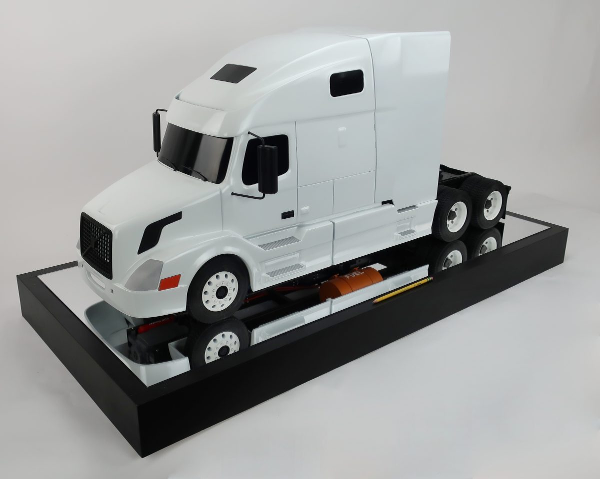 This truck model measures 44" long and 20" tall. The entire cab is removable to see the engine as is the shroud behind the cab. Our customer has a proprietary piece of equipment (not shown) that resides underneath the shroud.
