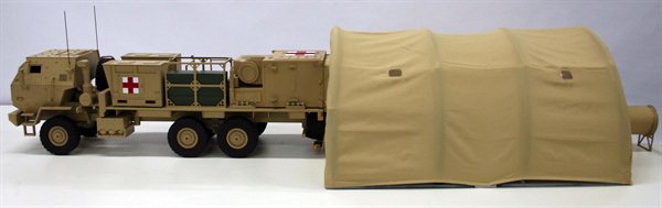 This is a five ton FMTV armored cab truck model with a specialized medical hospital payload. The model was built to 1/10th scale with the truck about 36" long. It was built for trade show use and has a metal frame and numerous metal details. The cab has separately applied bolt head and hinge details on laser etched acrylic armor panels.