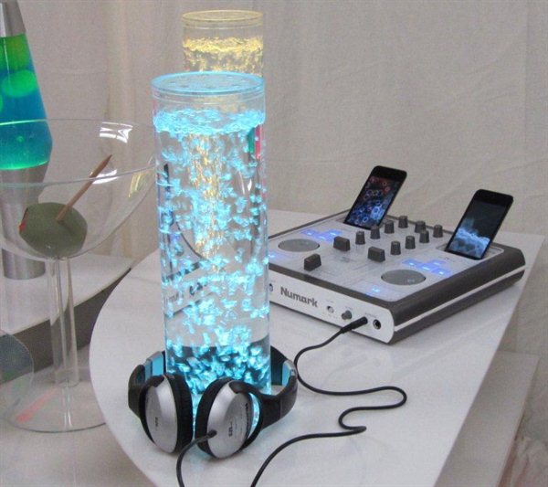 Our model makers designed a night club display model that evokes the atmosphere of a night club for the Kodak trade show booth. Laser cut acrylic formed the shelving to hold 3 lava lamps with custom built bases and off-the-shelf bubbling towers. A small turn table rotated a tray of mixed drinks made of hand poured and tinted silicone. A martini glass was constructed from slumped plexiglass with a turned ren board olive. Christmas string lights were rewired and installed underneath a milky plastic floor to simulate dance floor lights. Two custom ipods were installed into a mixing board with moving lights.
