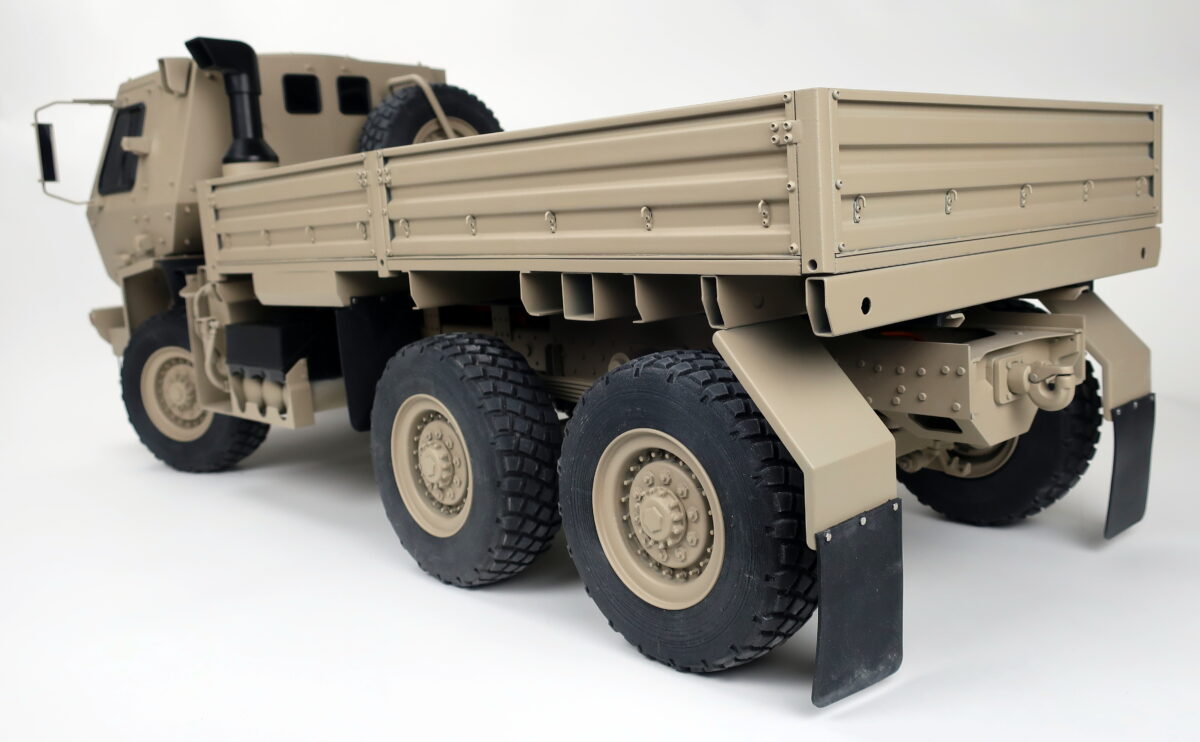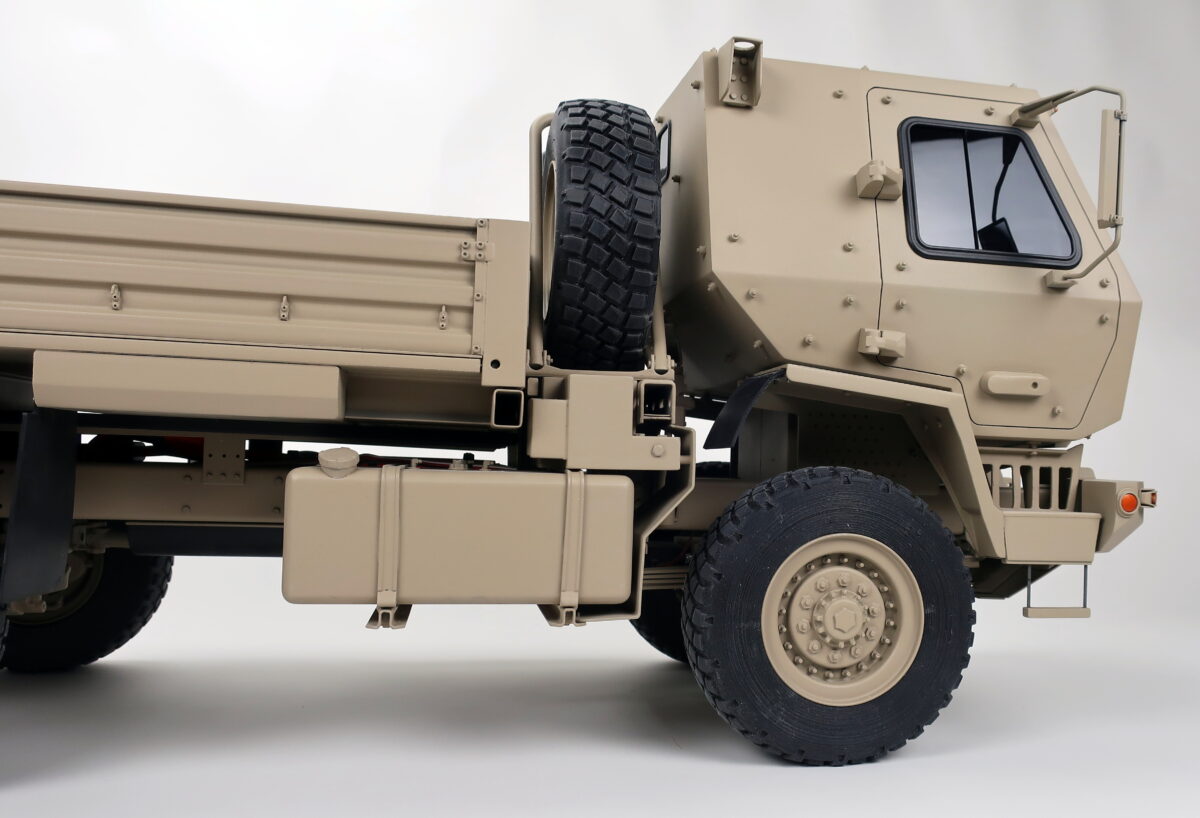 The Oshkosh FMTV 1/8 scale model is one of the most detailed vehicle models we've ever built. Every detail is accurate to scale down to the tires, which are rubber and were custom designed and 3D printed specifically for this model. All possible small details were included including the door handles, mirrors, lights, mud flaps, bolt heads, etc. were included. The frame is made out of bent sheet metal to and fastened using over a hundred bolts (as in the actual FMTV). Our ability to design and fabricate using a variety of materials, including sheet metal adds both strength and realism to our models.