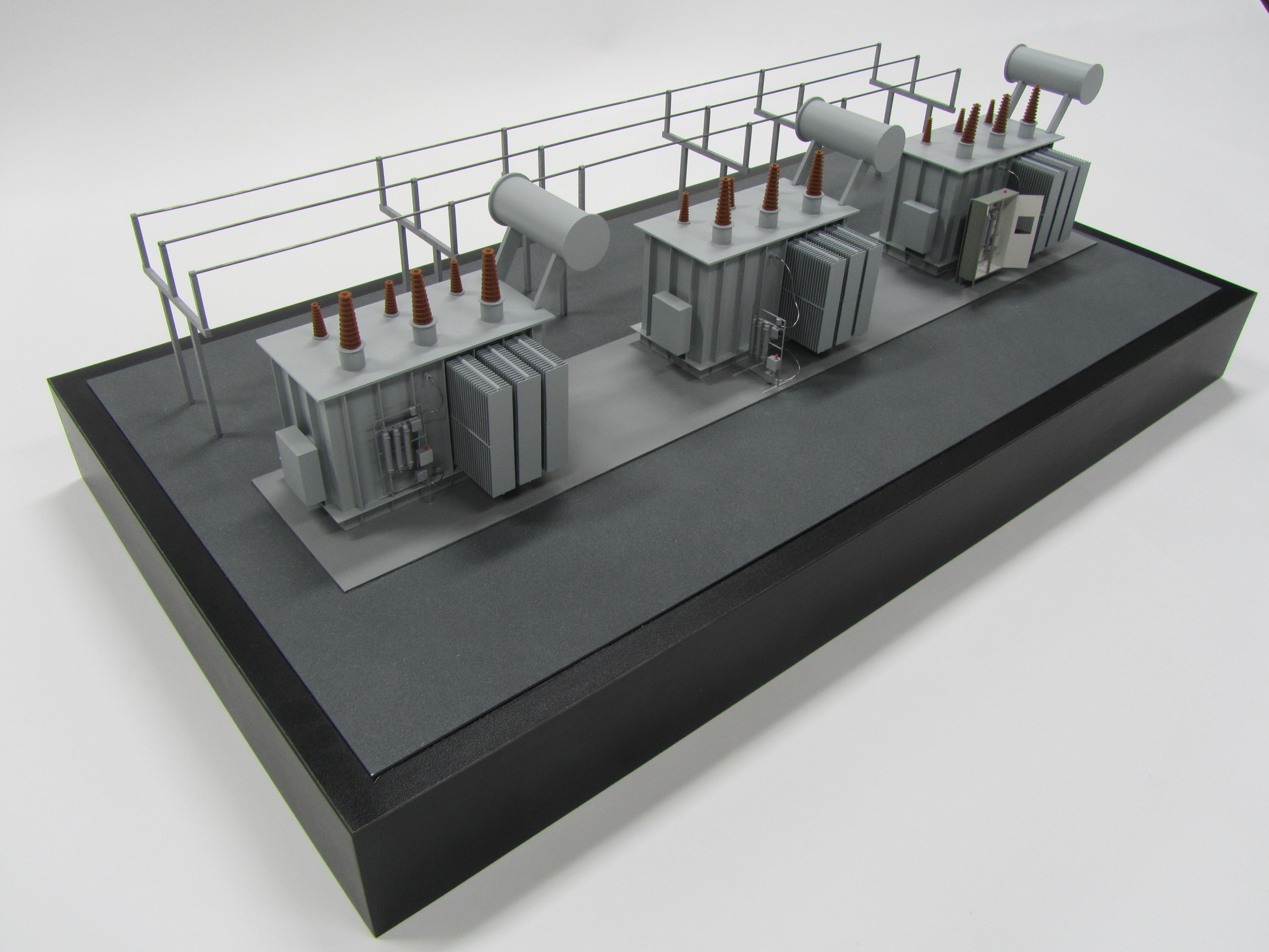 The transformers were modeled using reference photography, while the featured product—the moisture reduction and monitoring system—was built directly from detailed CAD drawings to ensure dimensional accuracy. The display is constructed from 3D-printed components, laser-cut steel, and a durable melamine base, balancing realism with long-term exhibit durability.