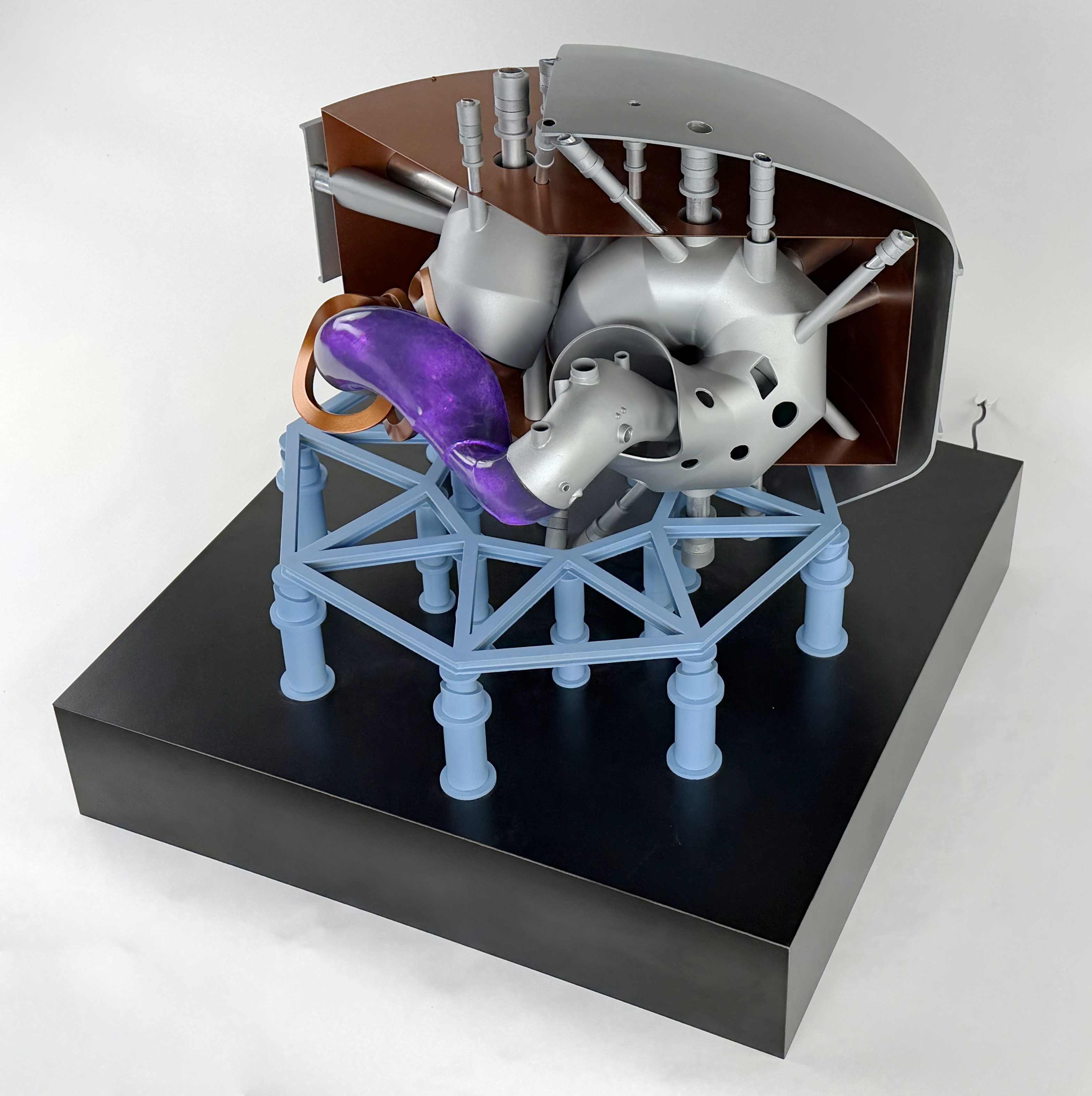 This 20-inch scale model recreates the geometry and functionality of a prototype stellarator-style fusion reactor, complete with dynamic lighted plasma animation that draws attention and clearly illustrates magnetic confinement processes. Designed to simplify a highly technical concept, this model allows audiences to understand how fusion energy is generated, controlled, and studied.