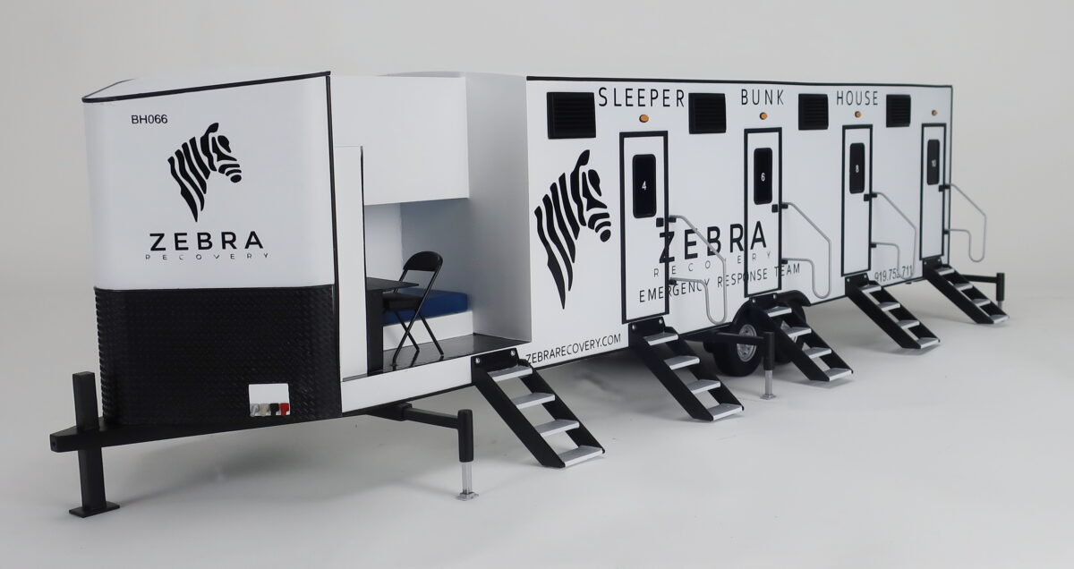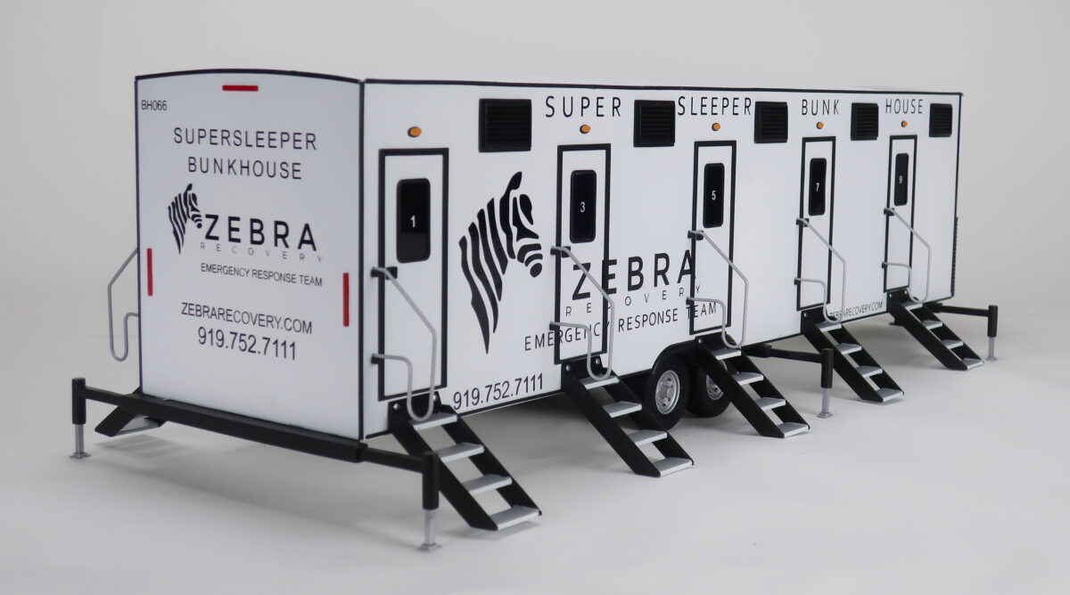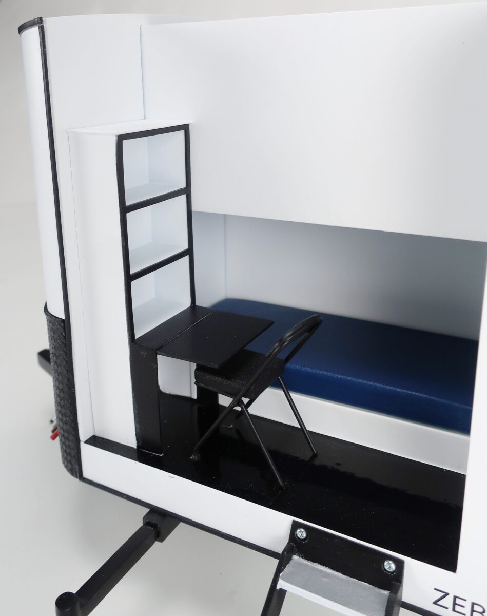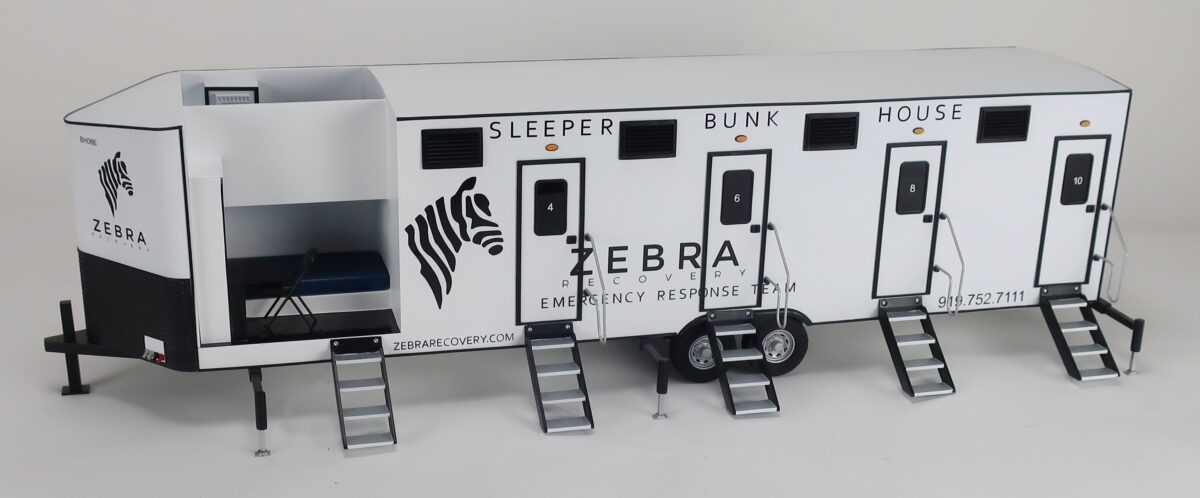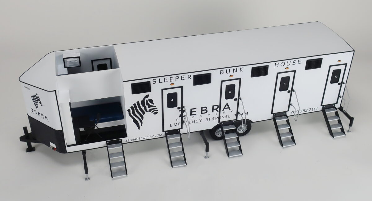 This sleeper trailer model is 1/16th scale and is about 30" long. The trailer scale model is cutaway to show the interior of the bunkhouse and the layout of the each room -- one with an upper bunk and one with a lower bunk. These trailers are used in emergency situations where quick access to shelter is necessary.