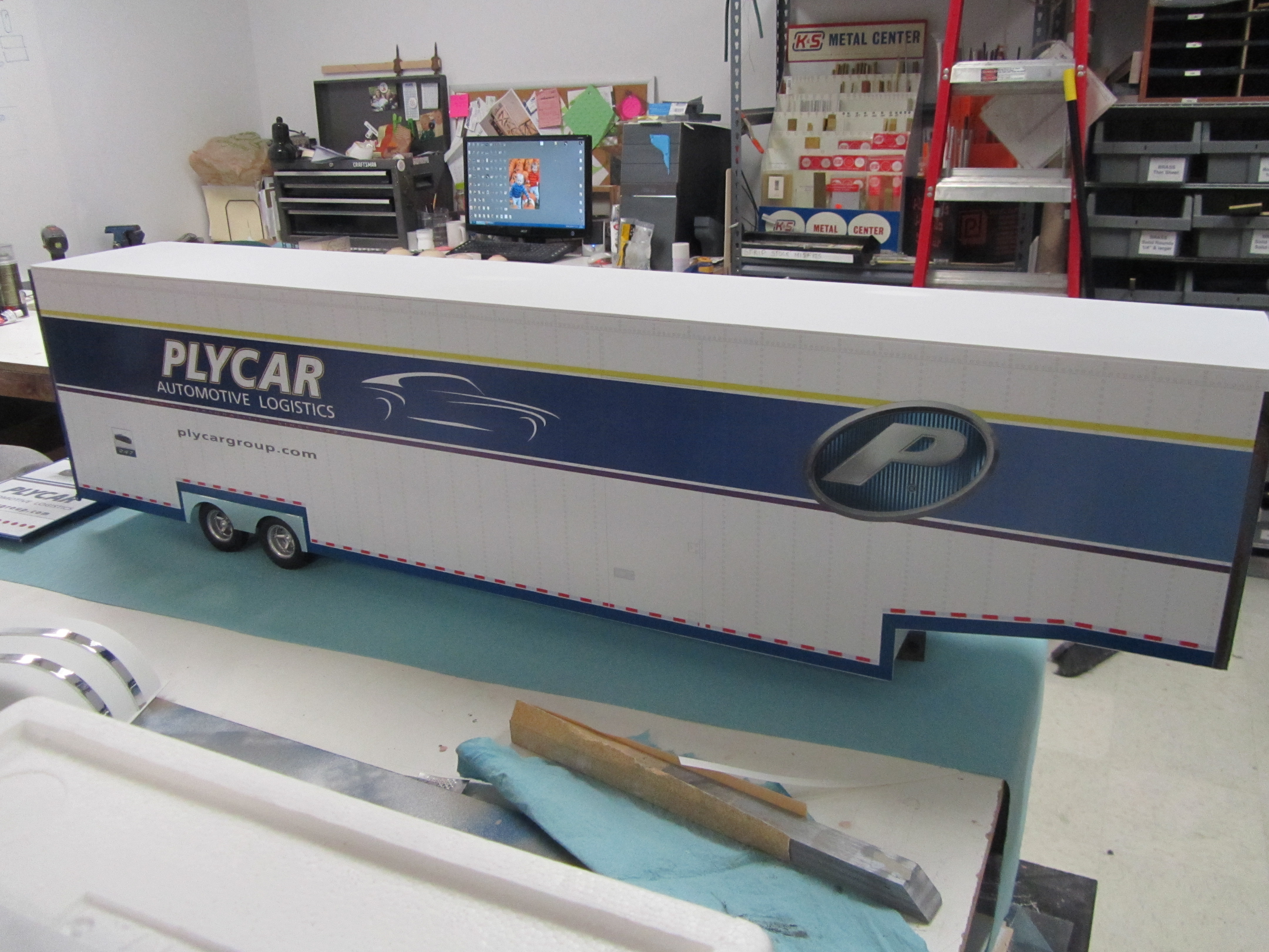 The trailer was scratch built from laser cut styrene. Vinyl graphics were added to the trailer which included both the company's signage and details found on the sides of trucks such as seams, rivets, handles, etc...