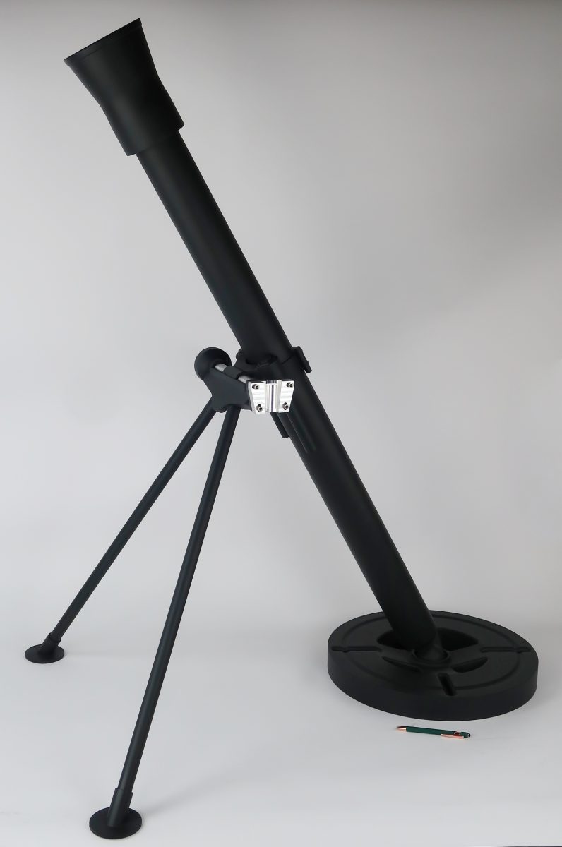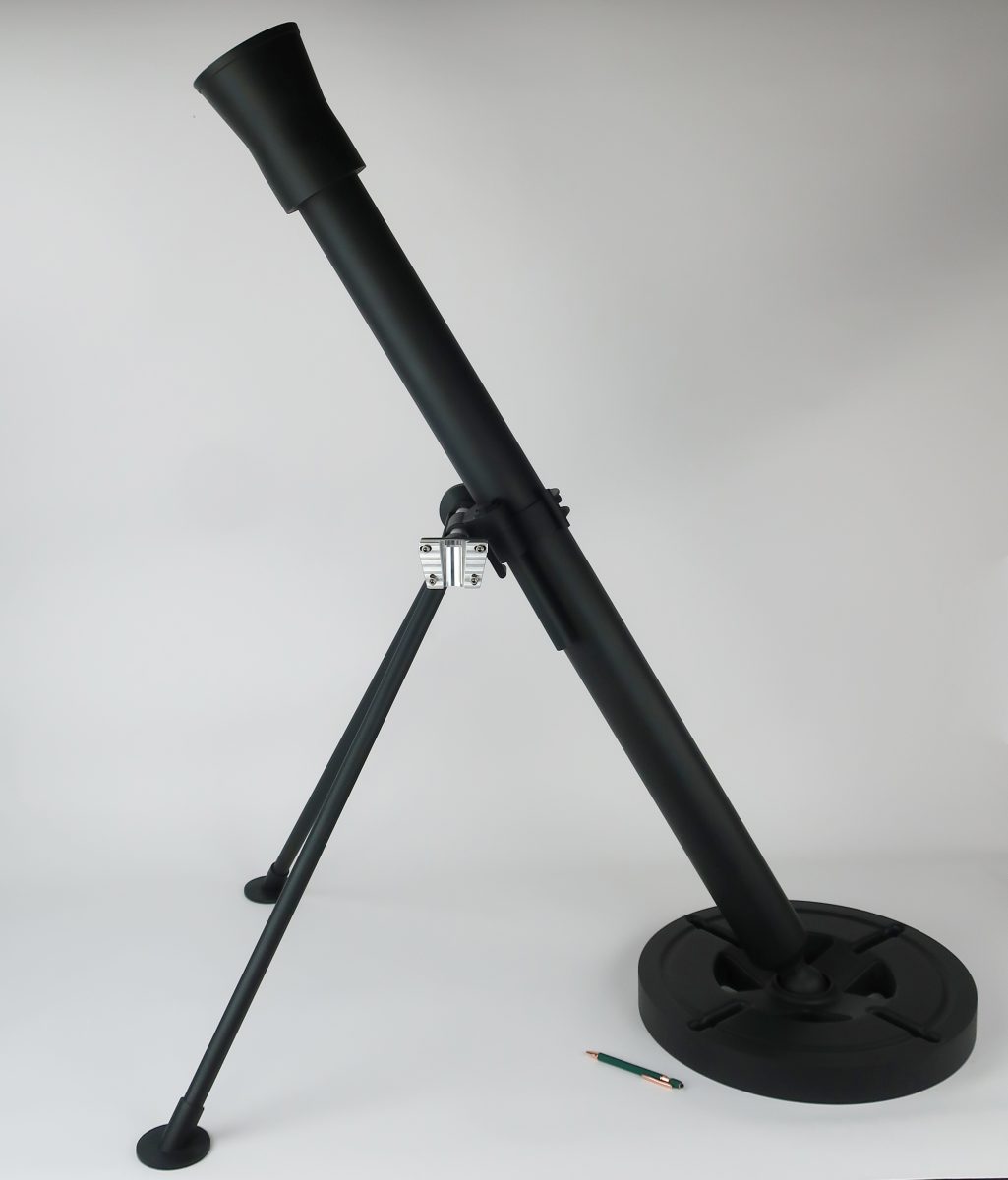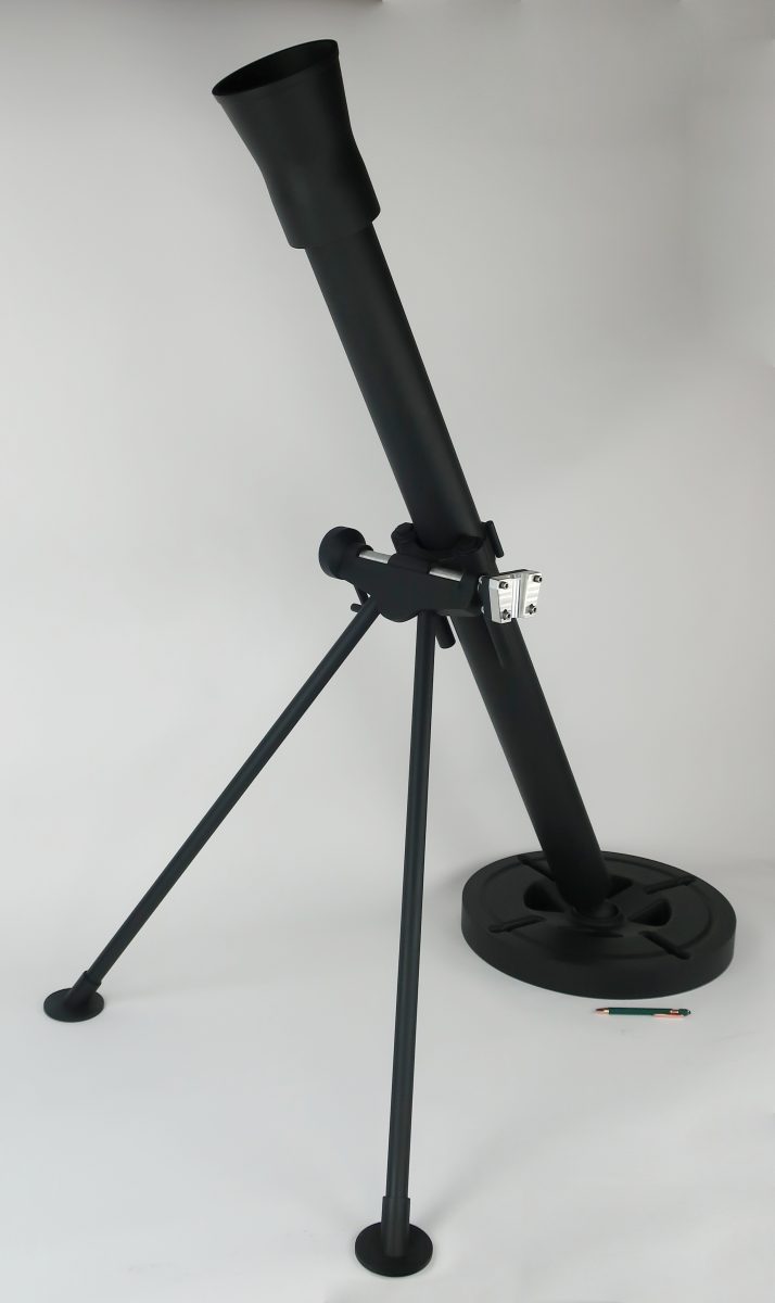 This full scale 81mm mortar model was designed to come apart in 6 pcs to make it easy to transport to customer events and trade shows. The pieces include 1) 2pcs PVC tube that join in the middle, 2) a center bracket that includes the aluminum machined optics dovetail, aluminum cross-pin, and 1/4" aluminum bracket that holds it all together 3) 2 steel legs and 4) an 18" 3D printed base.
