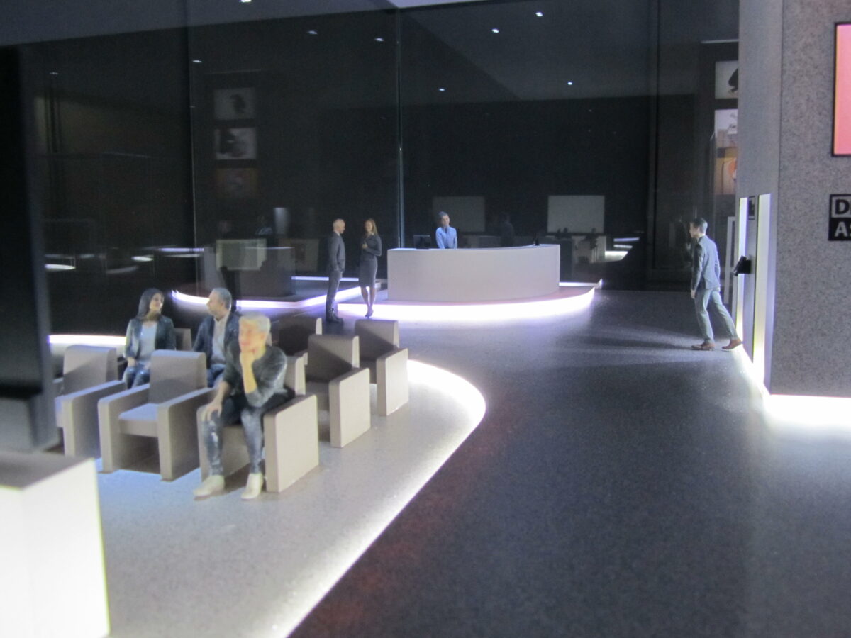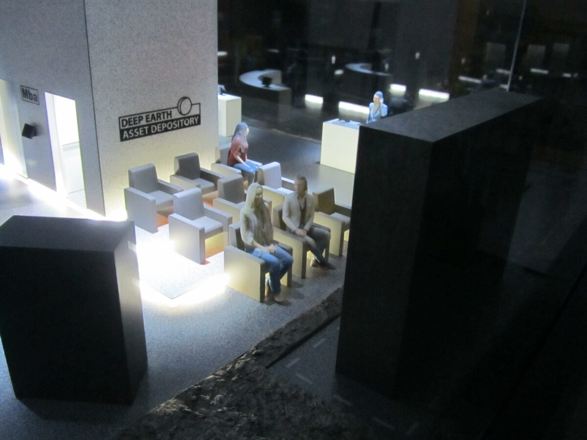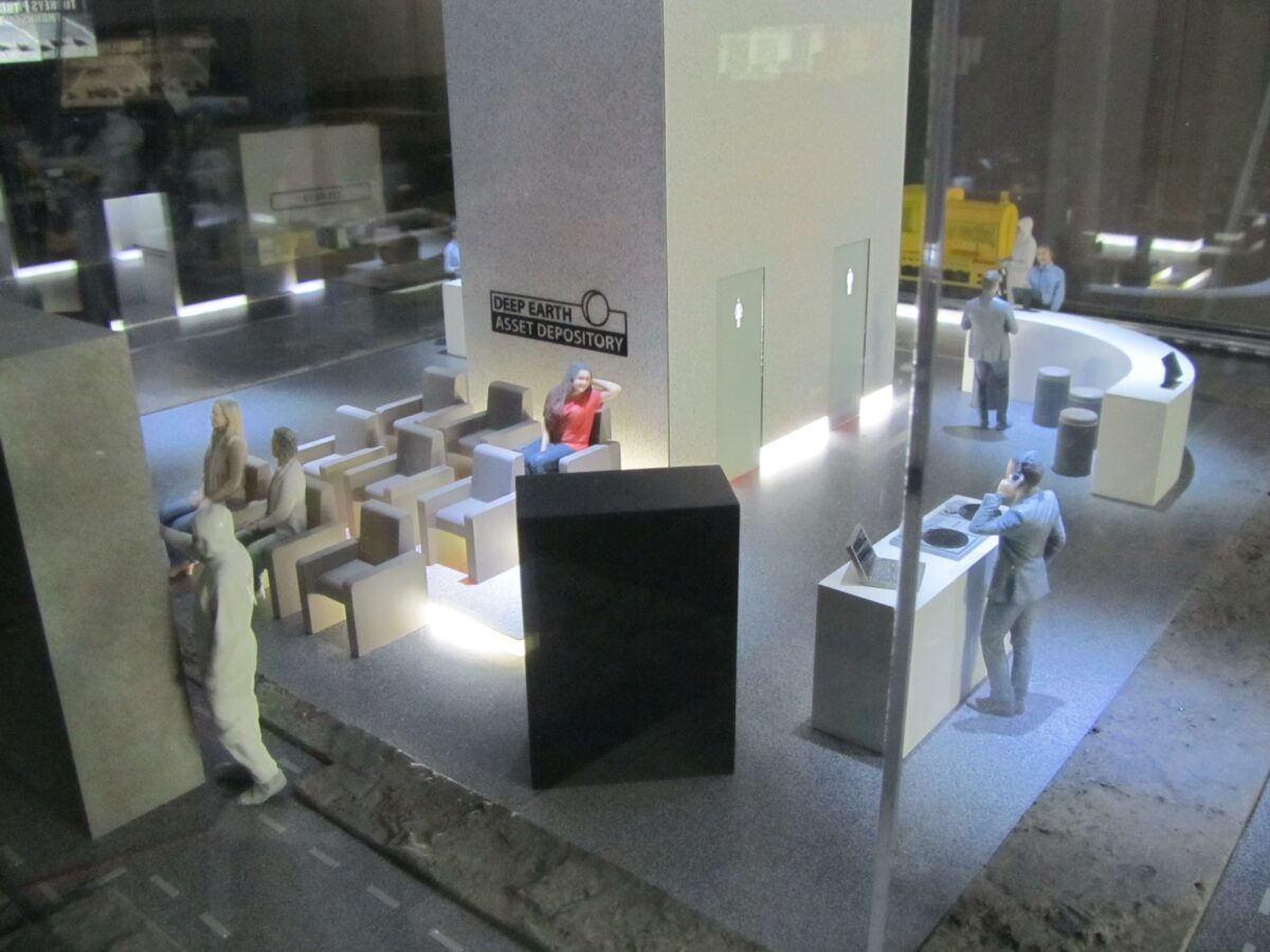 The art tower model rests in a handmade cabinet, with plate glass walls and extensive, elaborate LED lighting through out. The rock surface that the storage vault resides in was created out of chipped particle board, sealed and painted. The furniture was a combination of hand built materials and 3D printed parts. Our client's actual art work was miniaturized and placed on the walls of the storage vault.