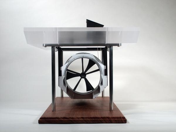 1/25th scale turbine model with a fiberglass shroud, 2" clear acrylic barge and brass support structure.
