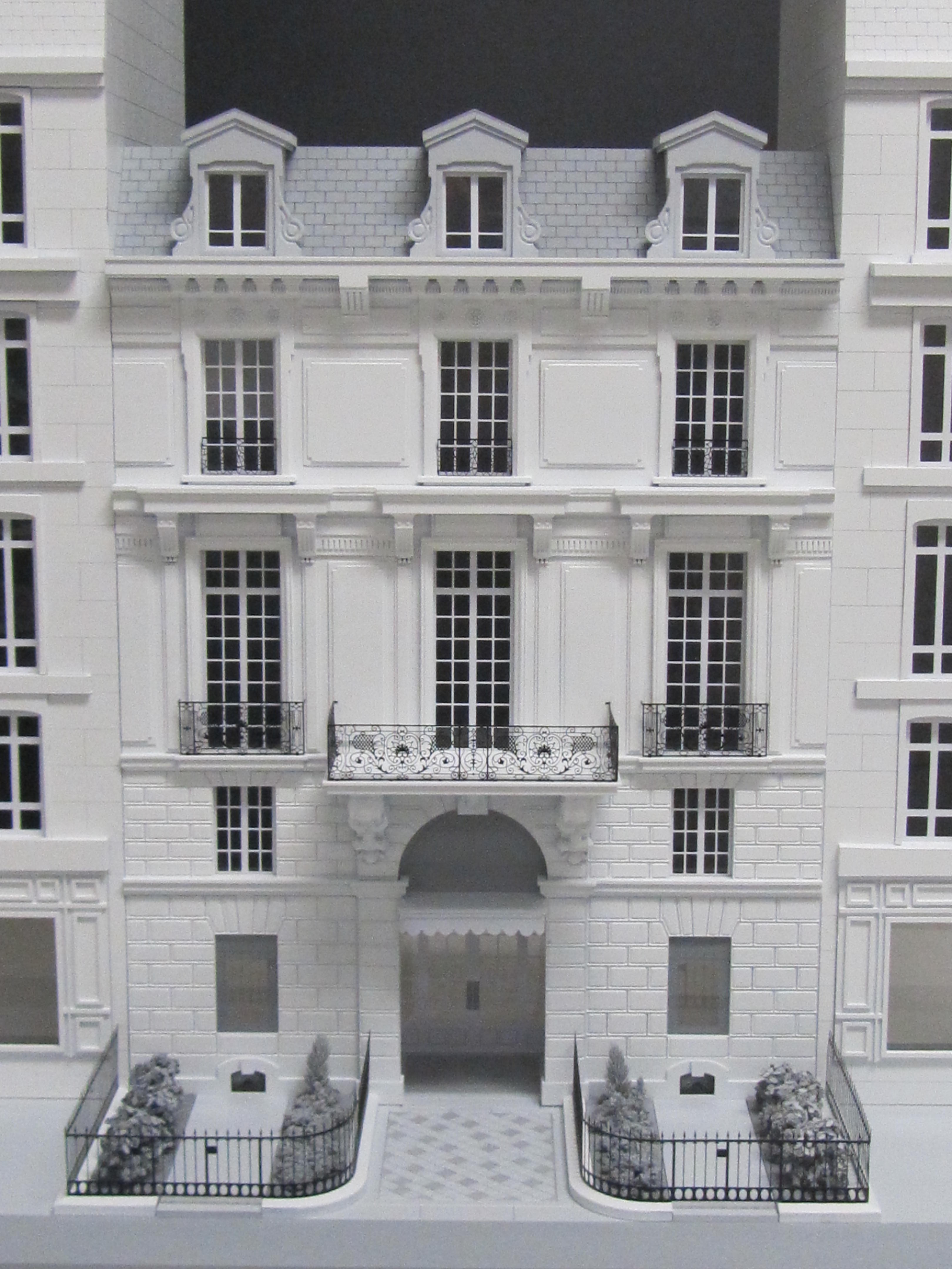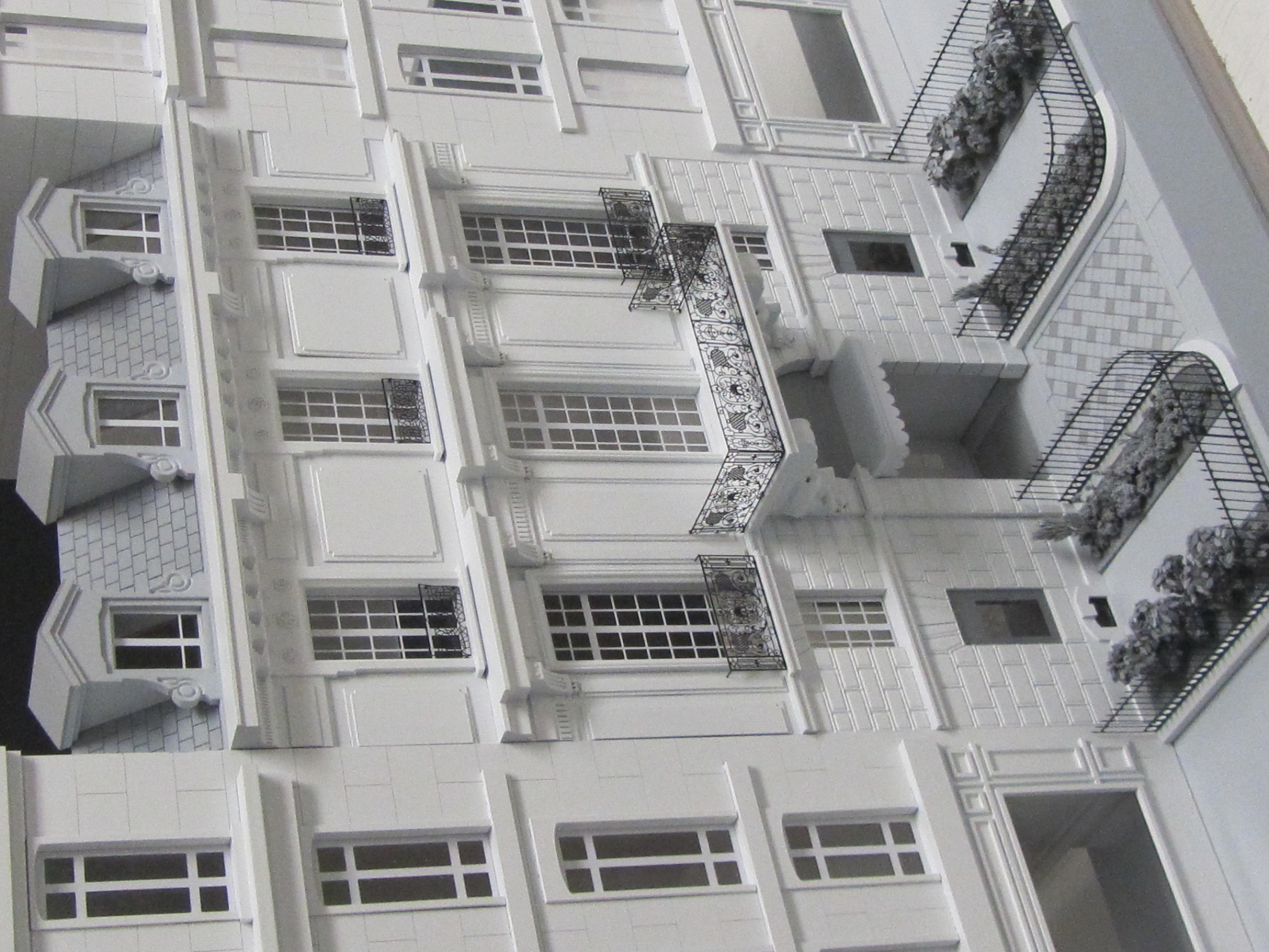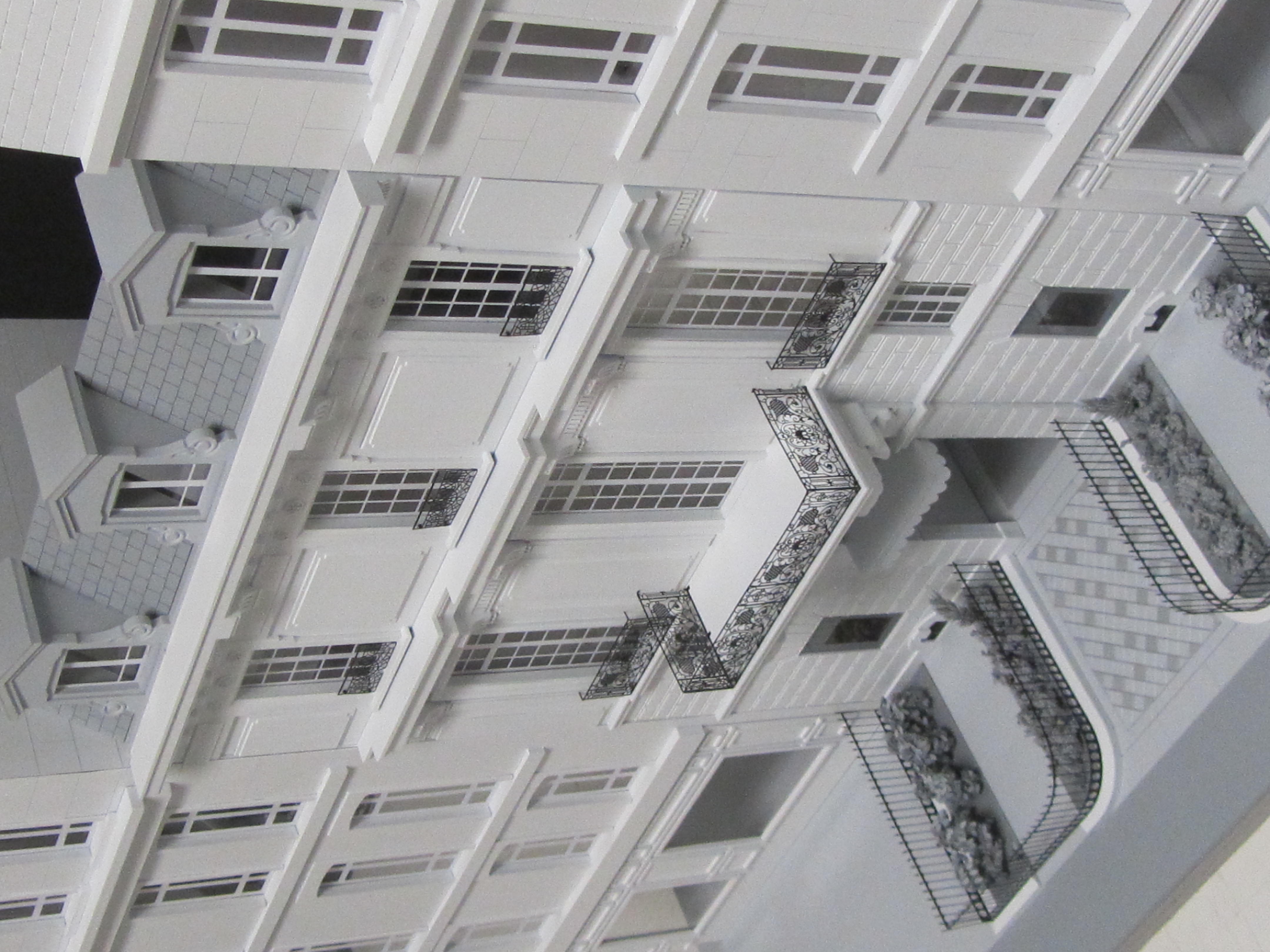 The walls of the building were made of laser cut plastic. It featured intricate railings around the windows, created by brass etching. Custom foliage was added to complete the look of this architectural prop model.