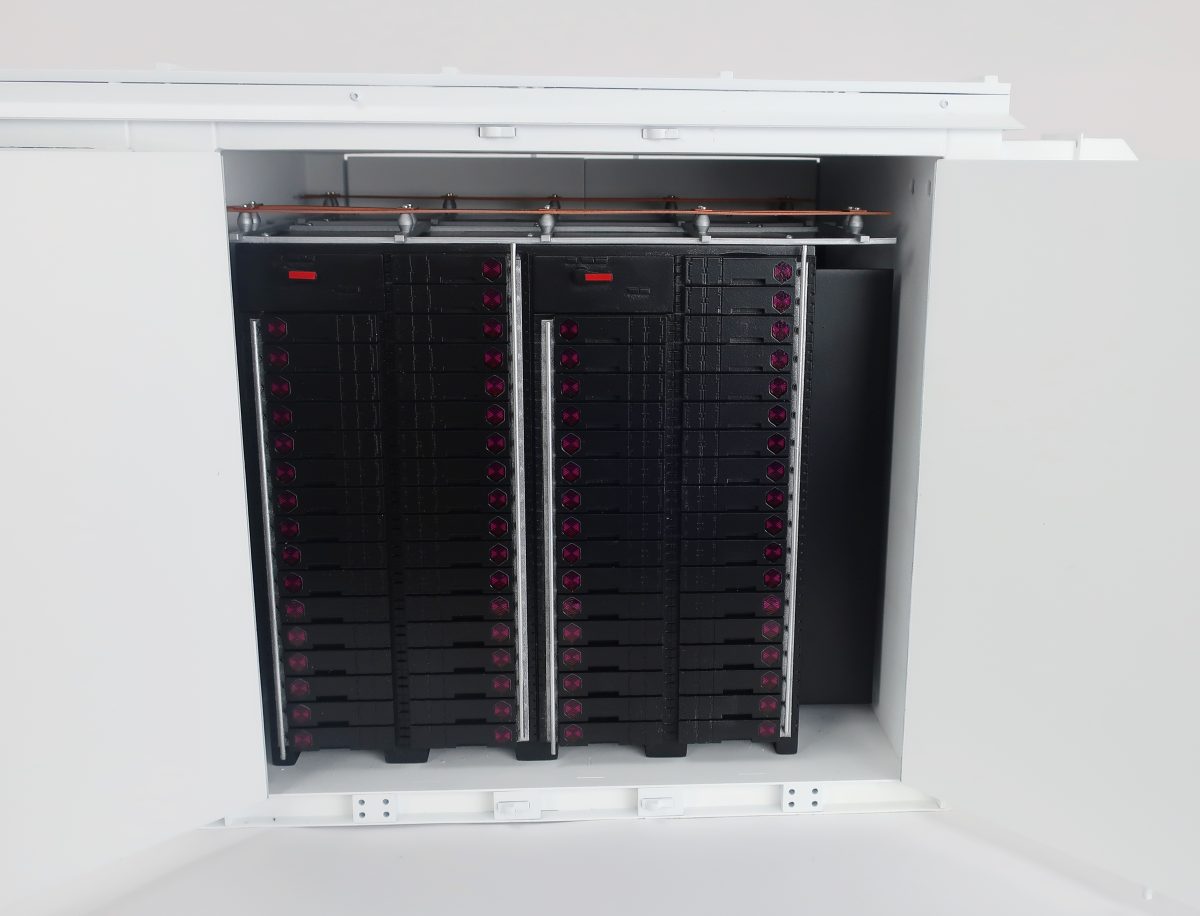 As the larger of two units produced for this project, the model measures approximately 36 inches wide and 12 inches tall. Both sides include functioning doors that open to reveal a detailed interior. This interior layout showcases the customer’s energy storage technology in a way that is easy for viewers to understand and explore.