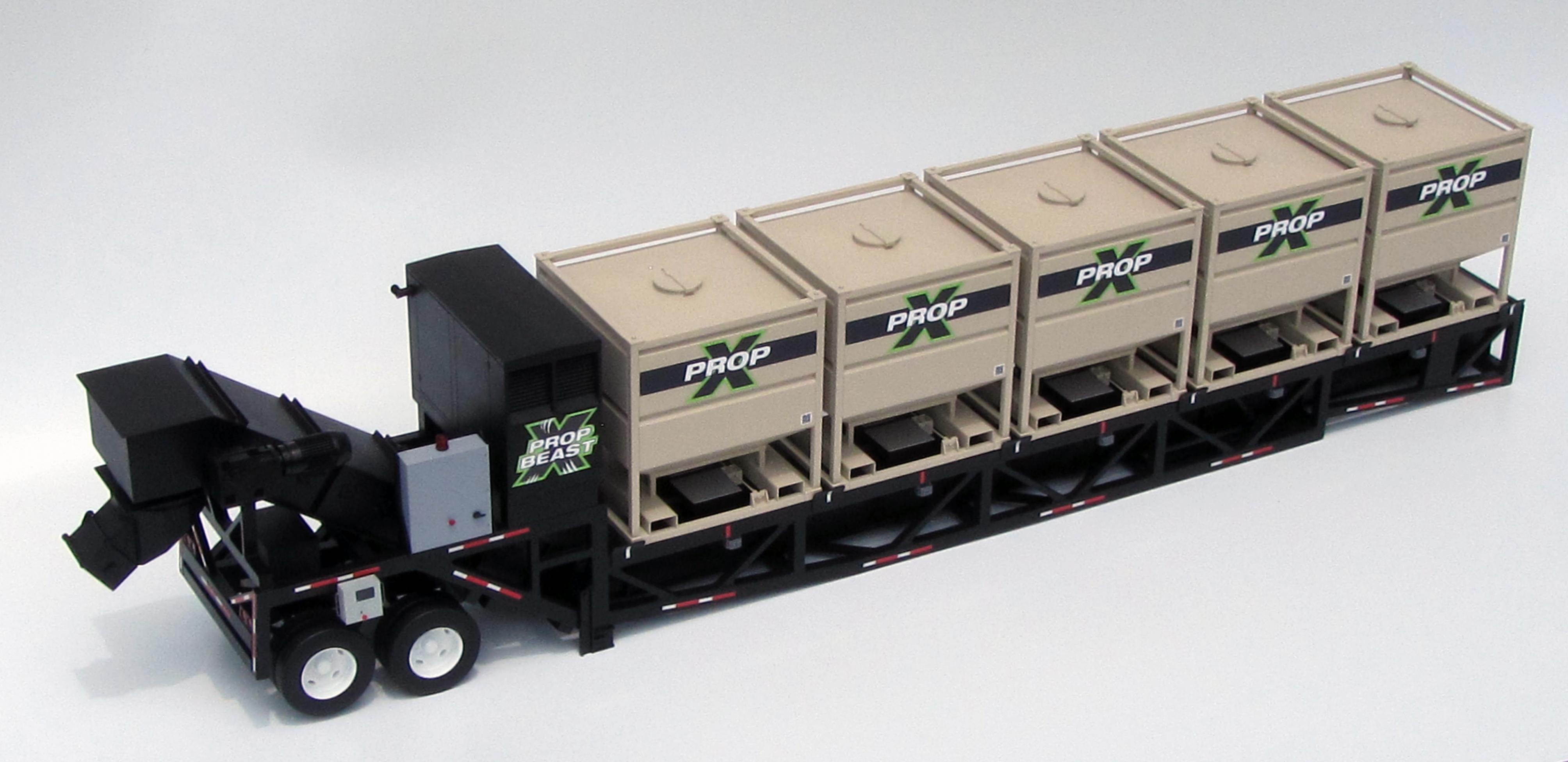 The model's design is modular and consists of 5 individual hoppers that are removable, just like the real product. The model includes a conveyor belt undercarriage that moves the sand along, and a shoot on the end of the trailer to deposit the proppant.