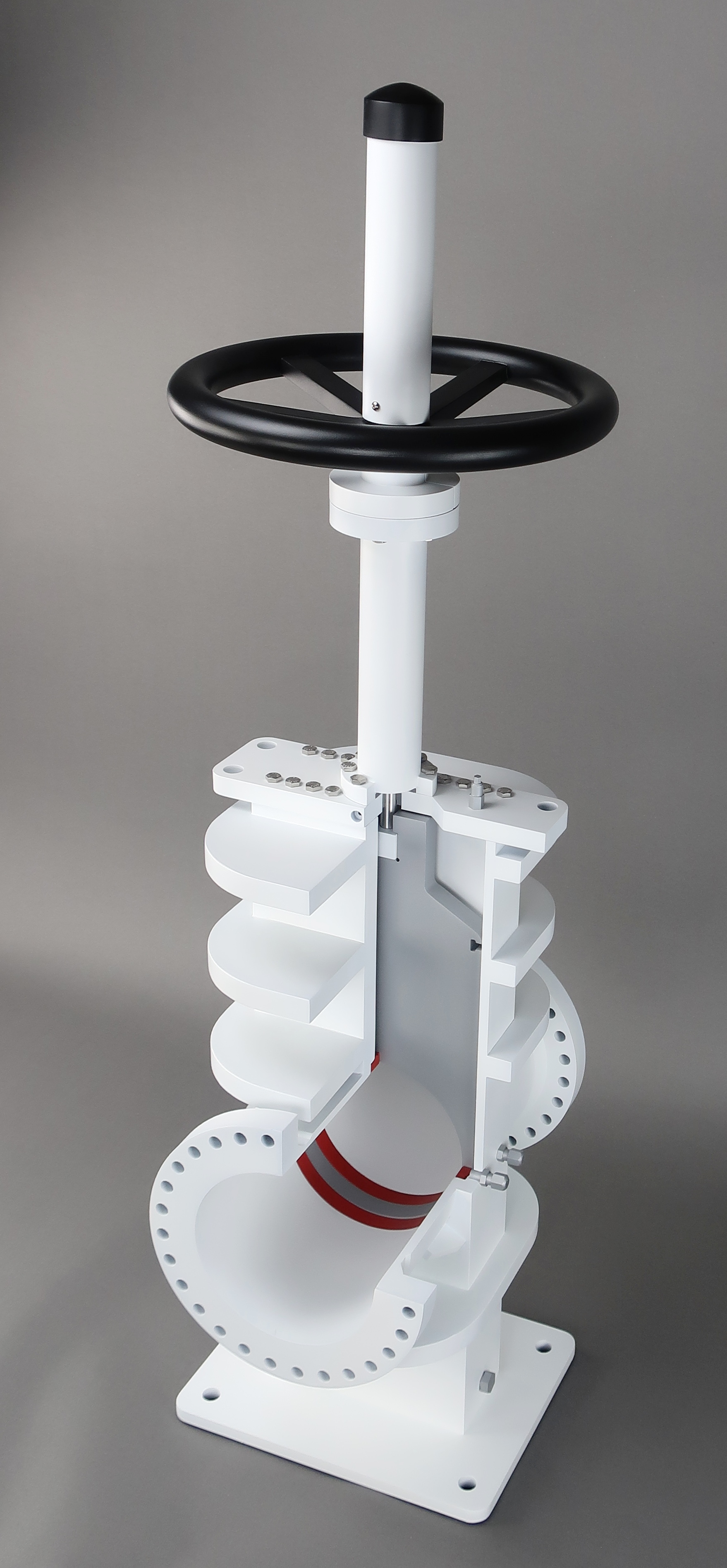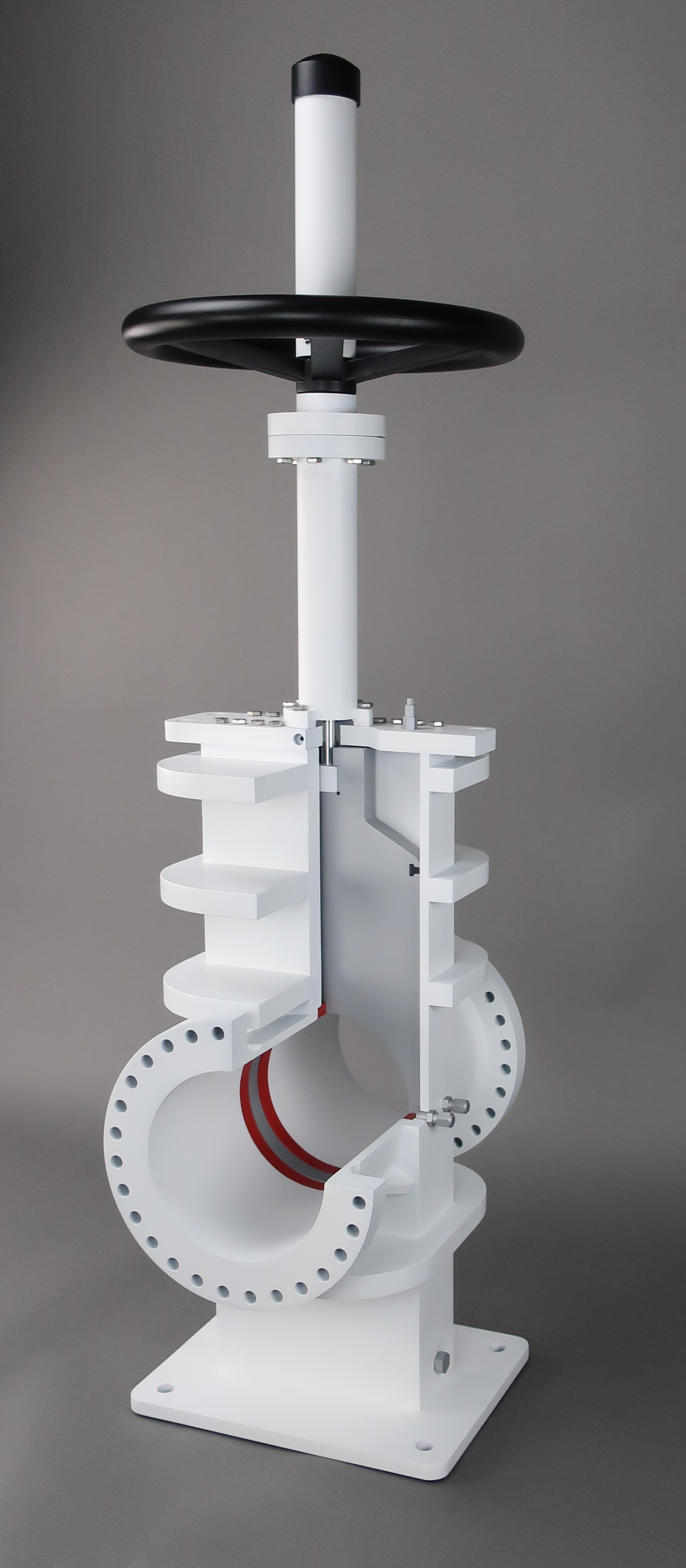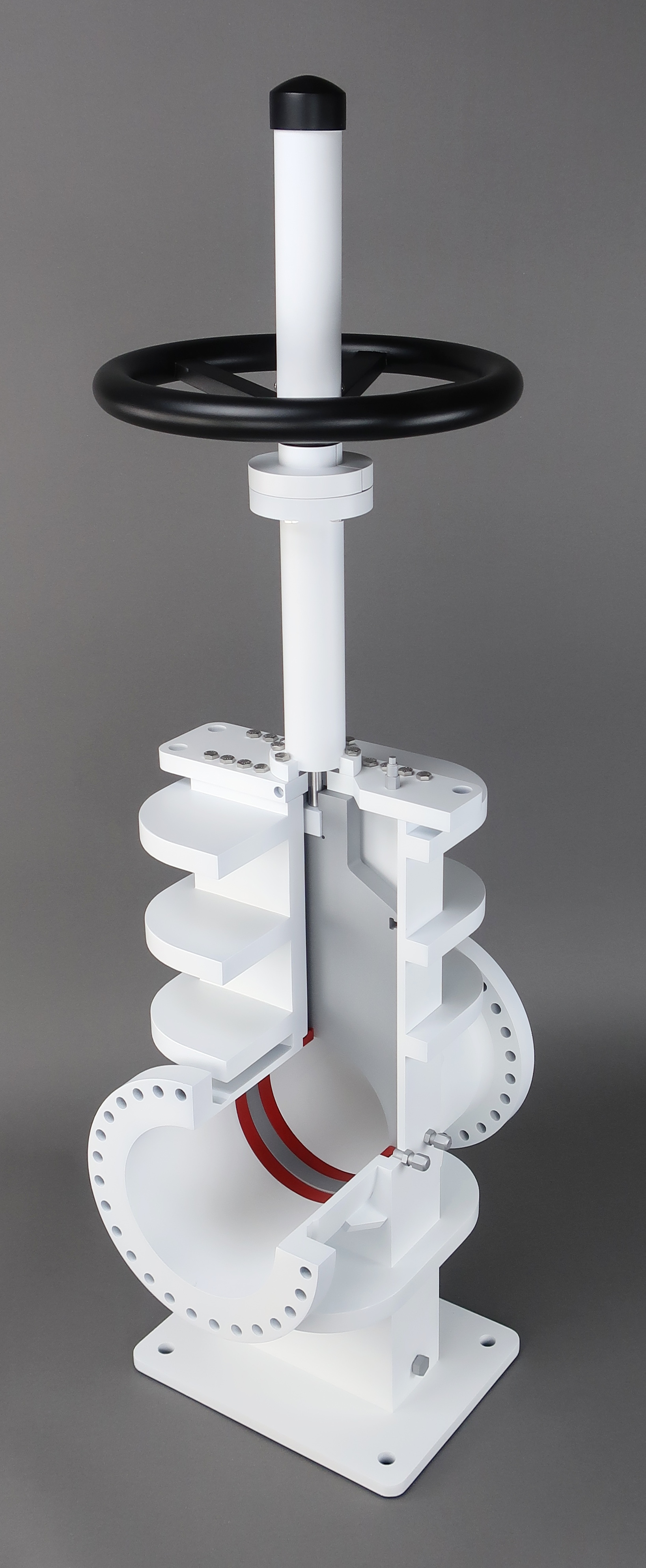 This 6" diameter gate valve model was designed for training personnel on the repair and maintenance of these valves. The gate opens and closes when the wheel is turned, all of the grease ports are represented and the seals are represented.