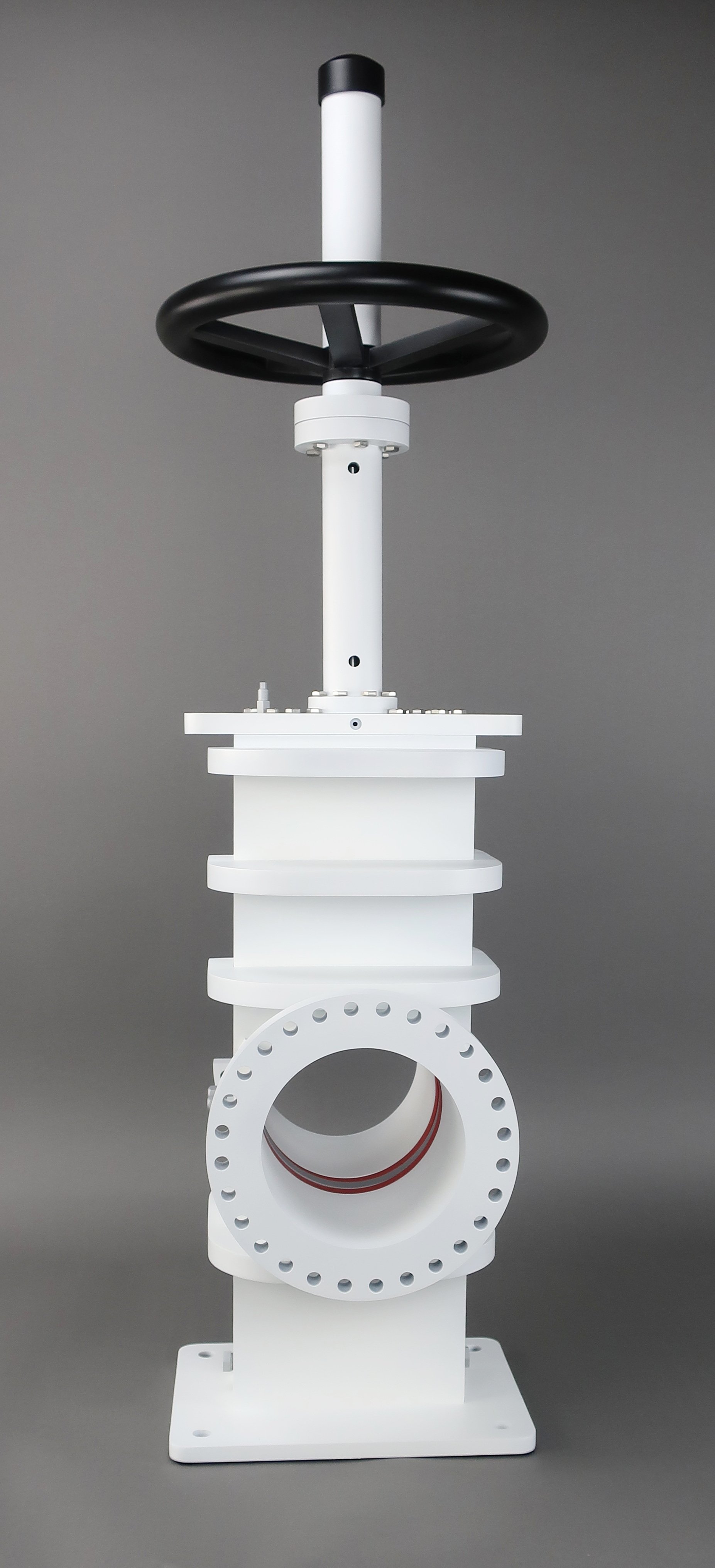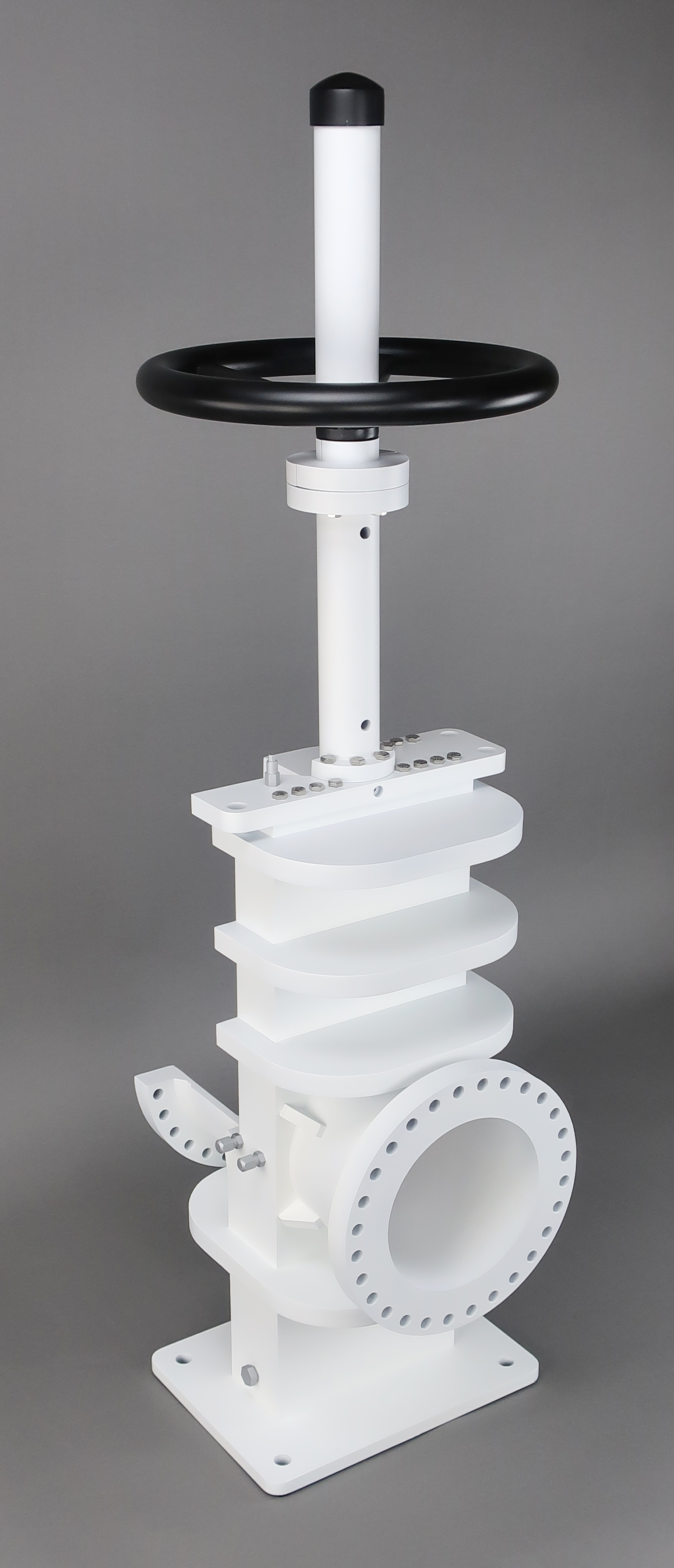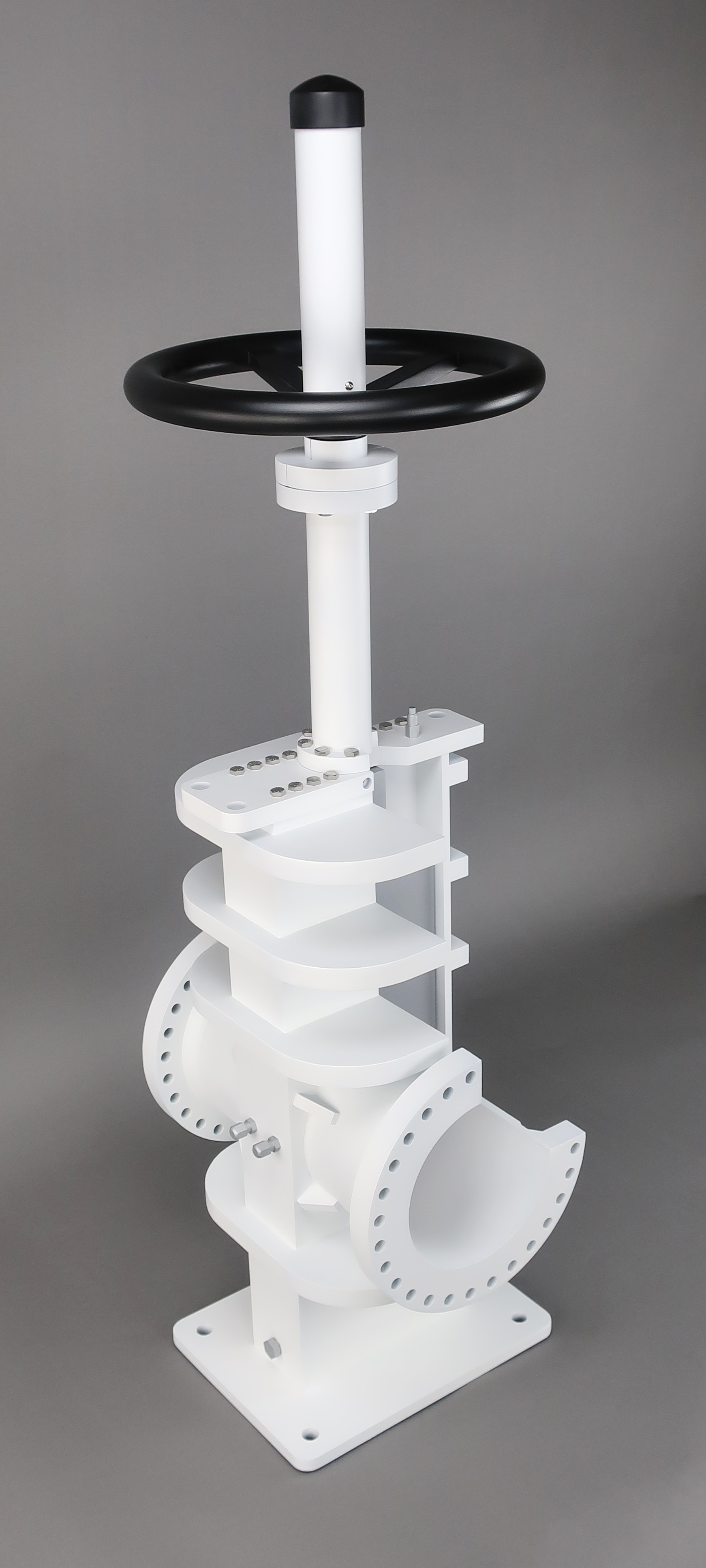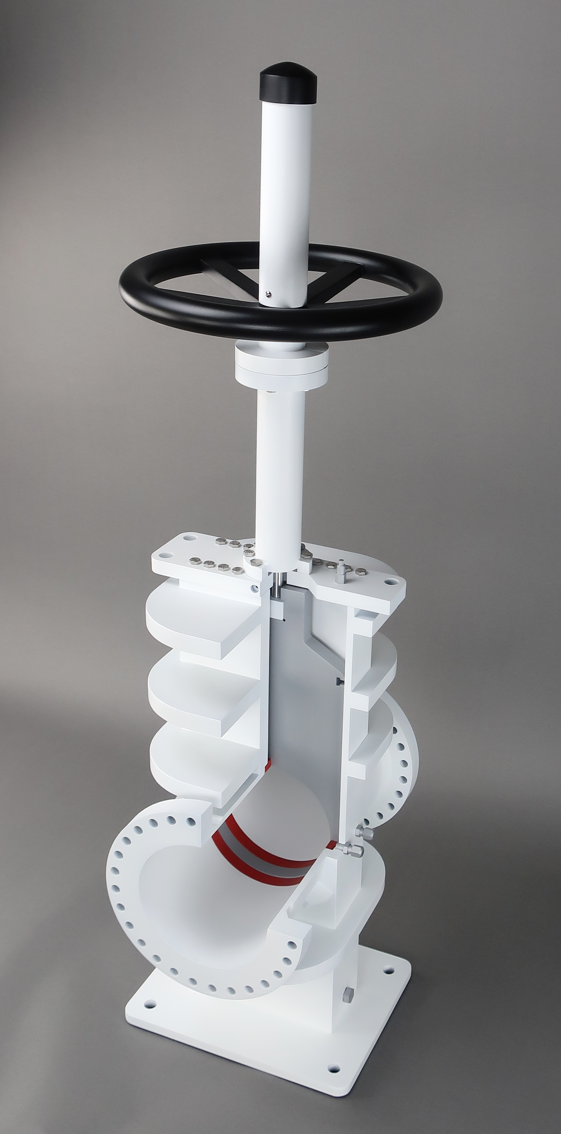 This 6" diameter gate valve model was designed for training personnel on the repair and maintenance of these valves. The gate opens and closes when the wheel is turned, all of the grease ports are represented and the seals are represented.