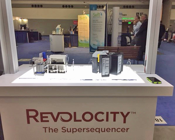 The gene sequencing model was made from 3D printed parts, machinist board and sheet plastics. It was shipped directly to a trade show to be displayed on a table lit from below. The whole model fits nicely inside a large Pelican case for ease of travel.