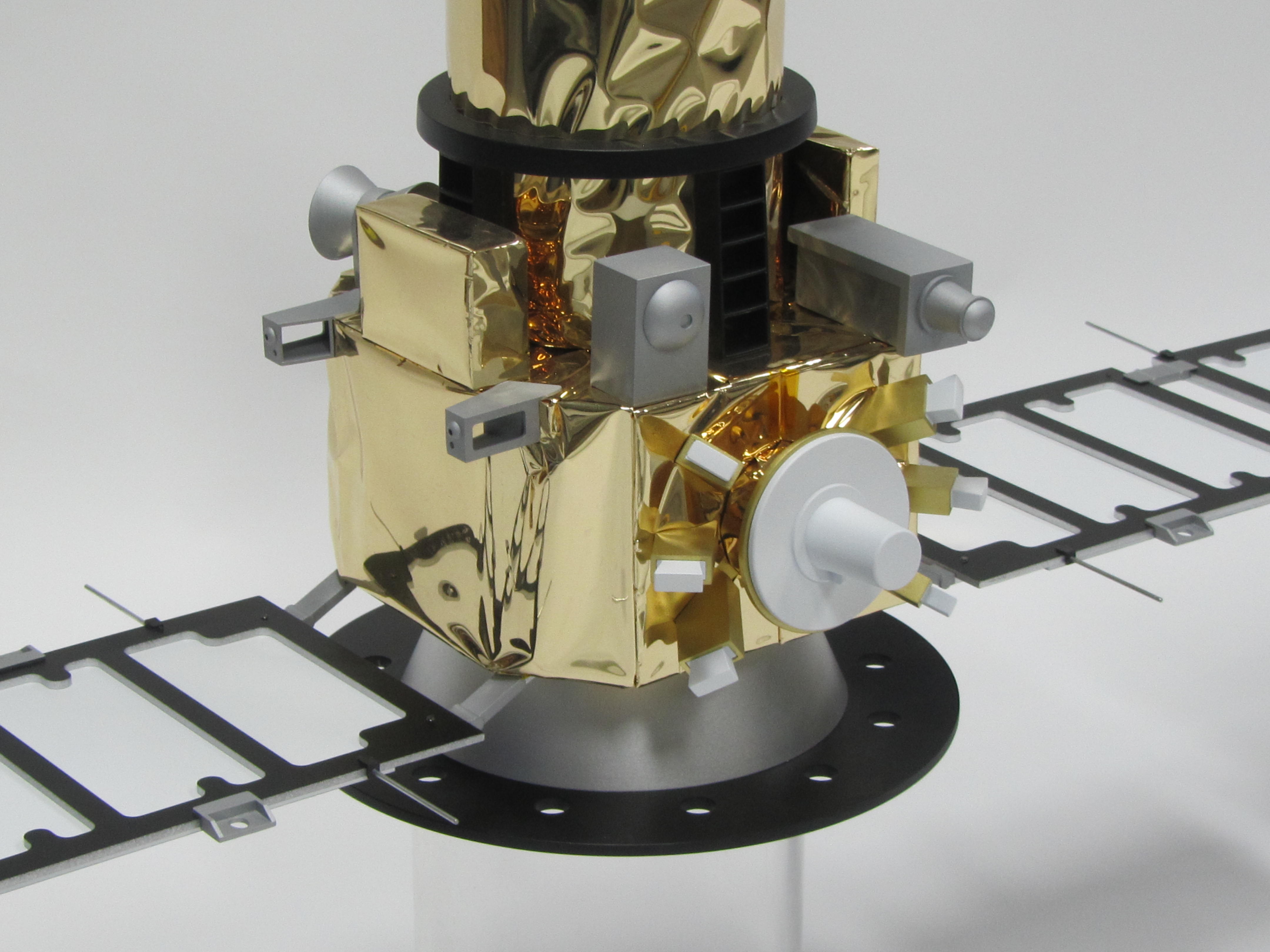 The body of the large satellite was made out of an actual telescope. Plastic tubing and detailed 3D printed parts were added, such as rails and sensors. A magnetic cover and special mylar was wrapped around the apertures.