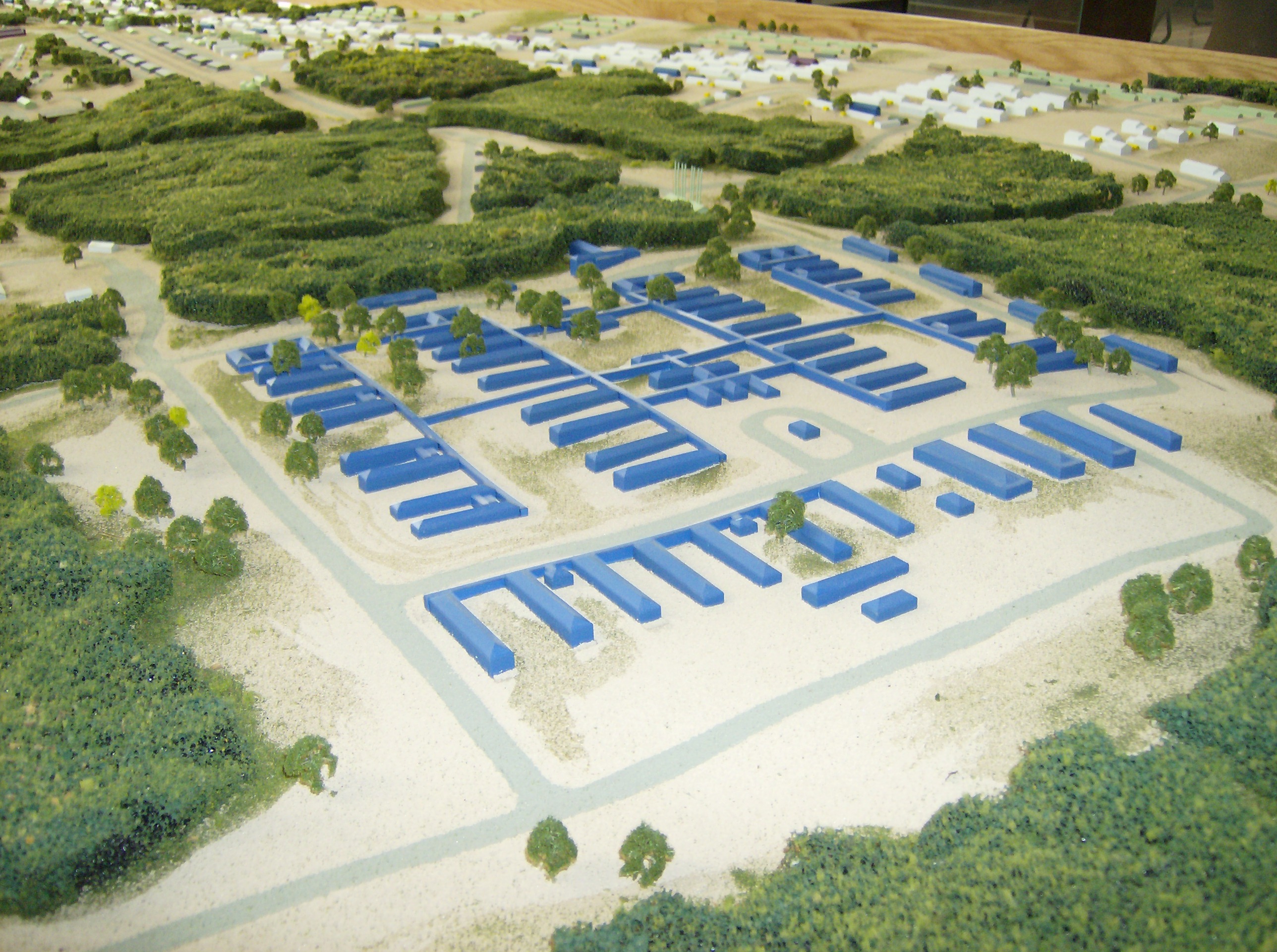 This architectural model depicts a military base, Camp Pike. It is very small in scale in order to cover a large area.