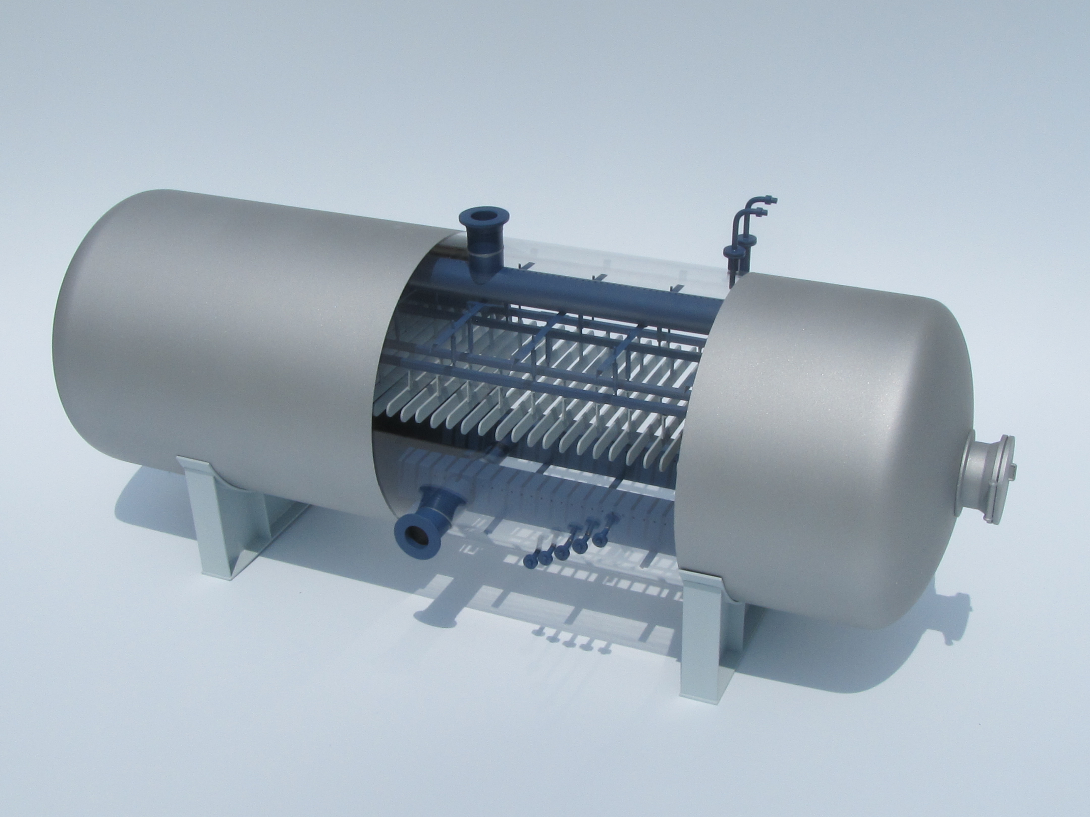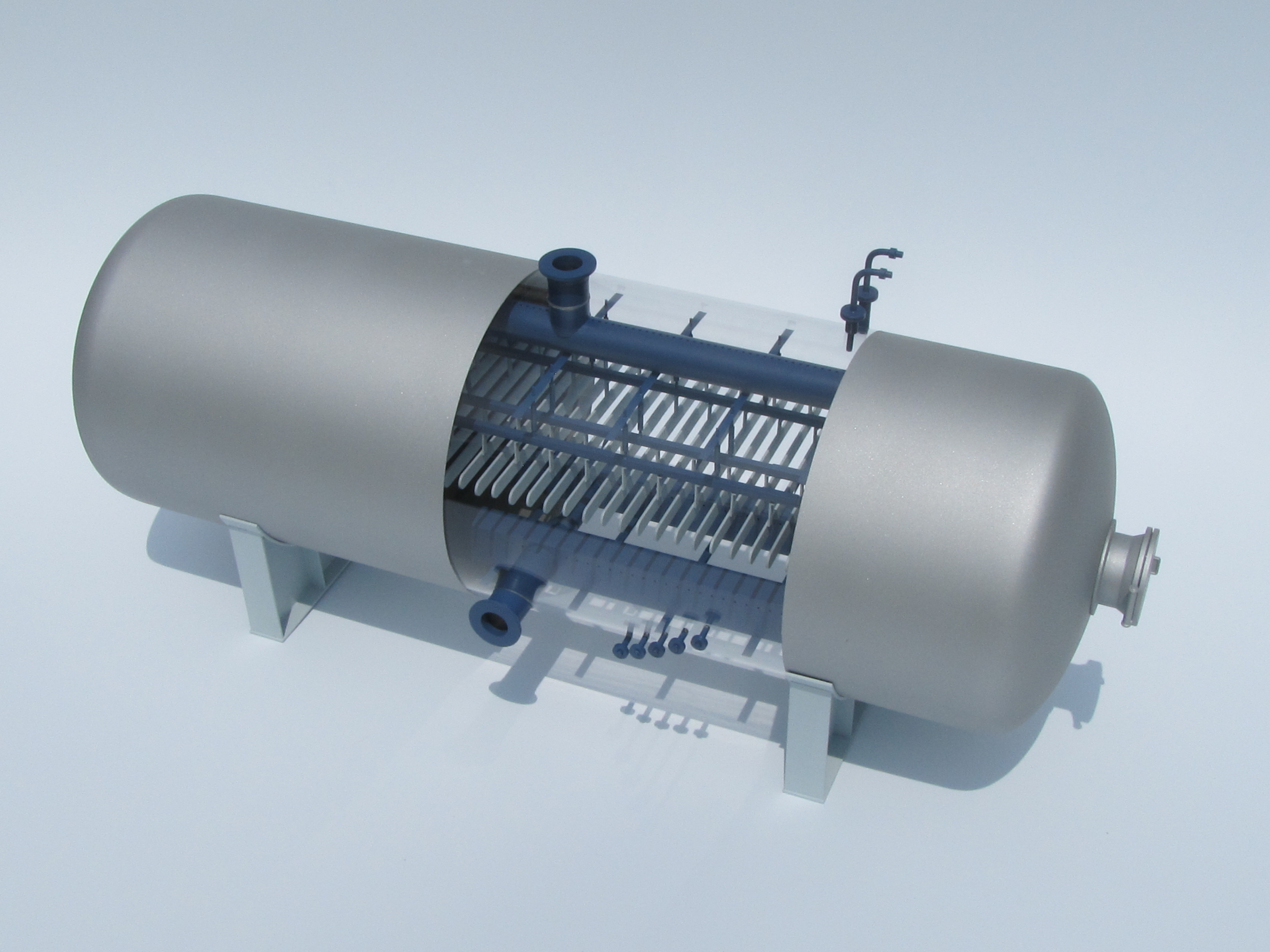 To create a stronger model, many parts were built out of soldered brass and aluminum extrusions. The body was made of acrylic tube with machined ends. The oil dehydrator model has a partial cutaway to reveal the inner workings. Some of these detailed interior parts were 3D printed.