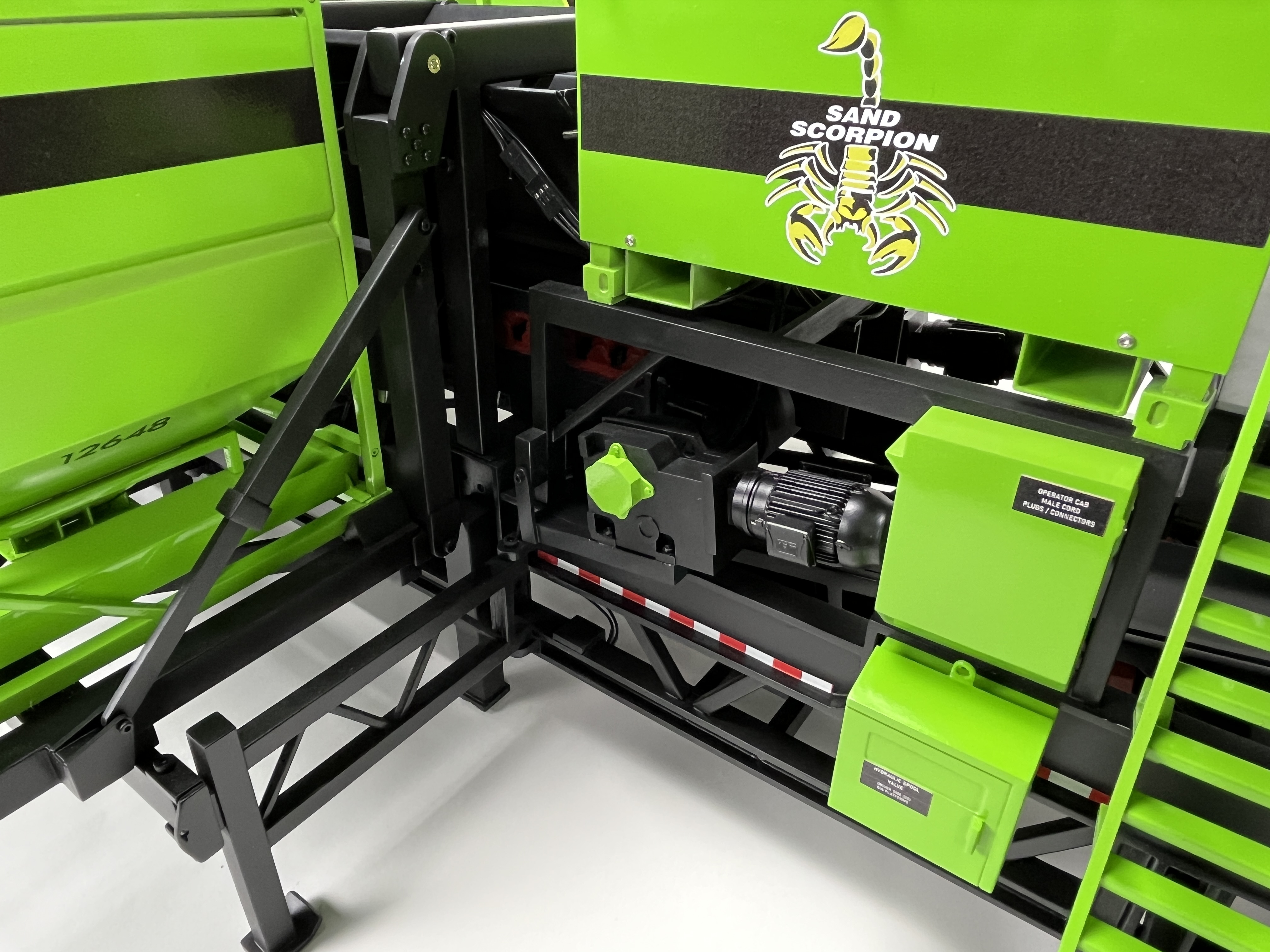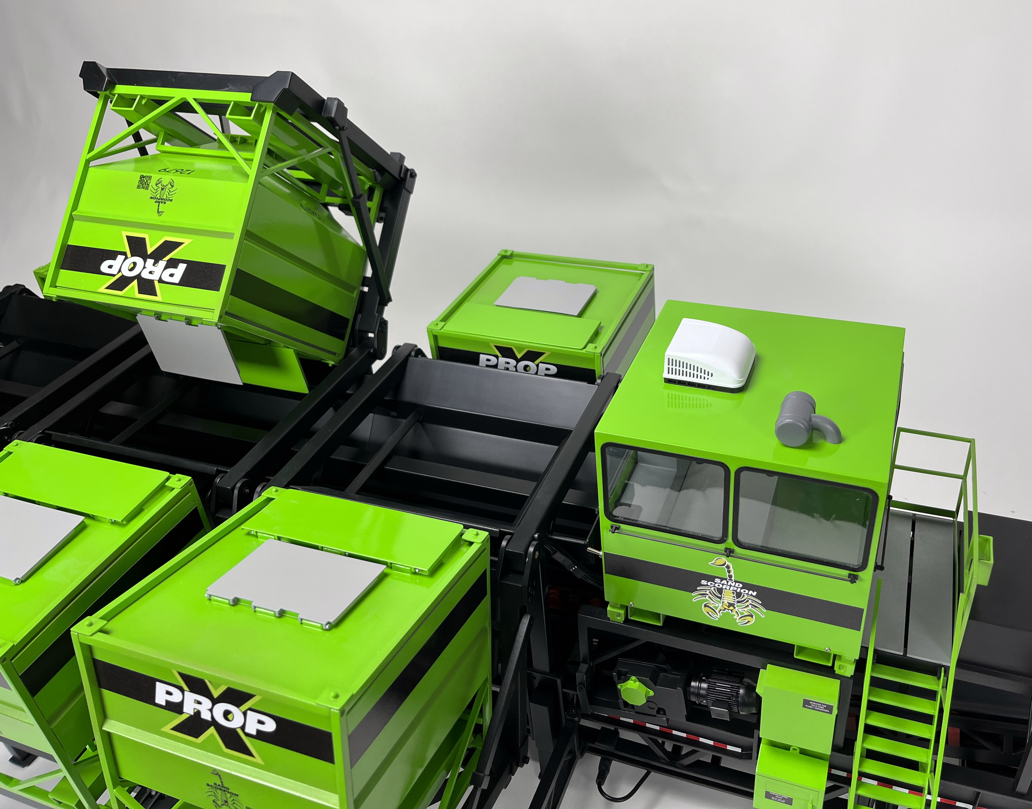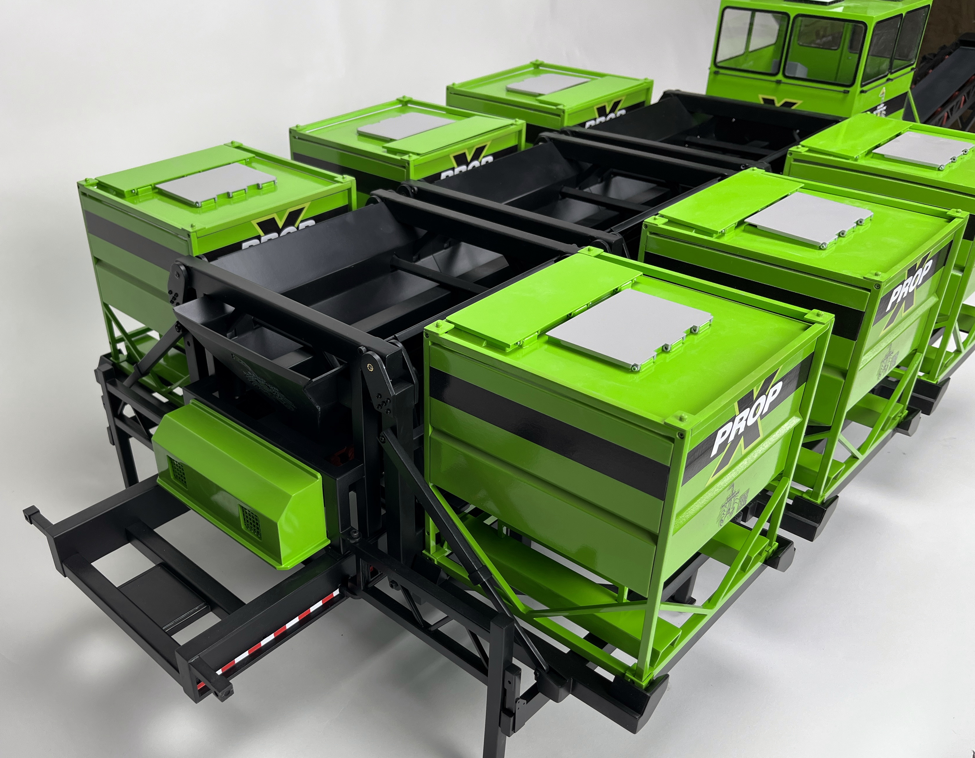 This amazing model is 6ft long and was a lot of fun for our team to build. Three of the bins are animated using linear servos and are programmed to dump at random intervals. The model was built with a variety of materials including sheet-metal and 3D printed plastic parts and mechanical movement features have bearings to help prevent wear.