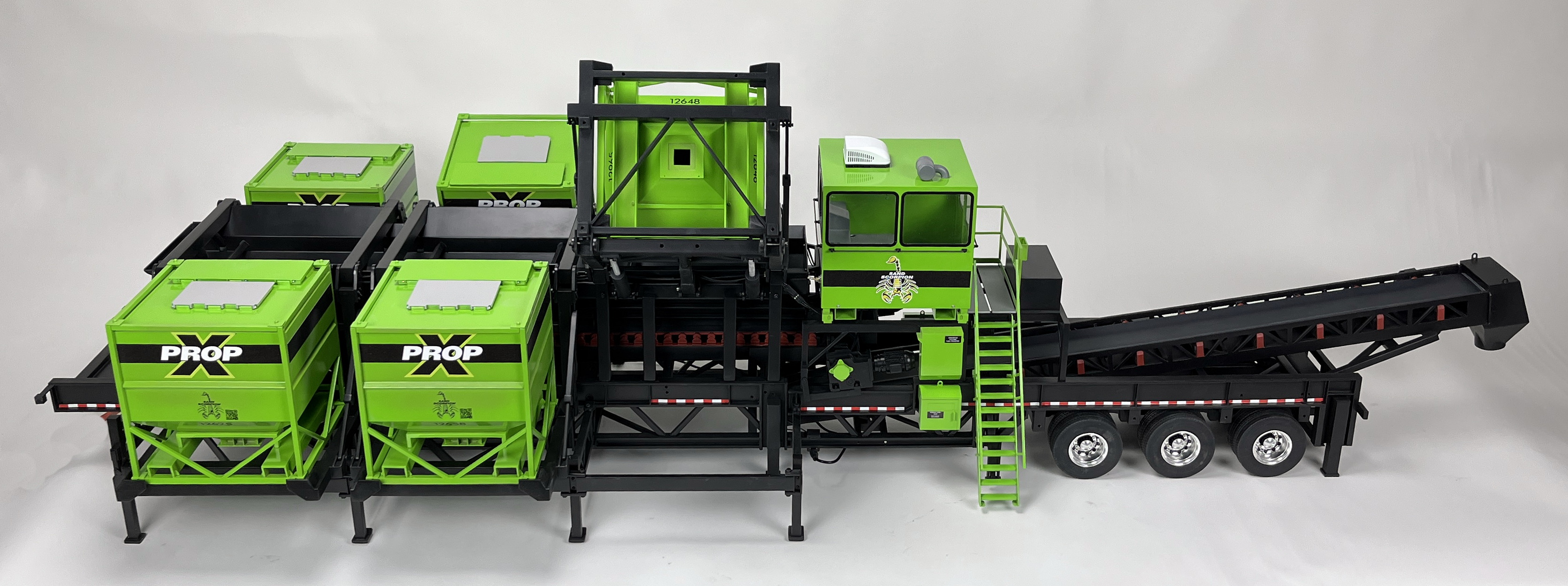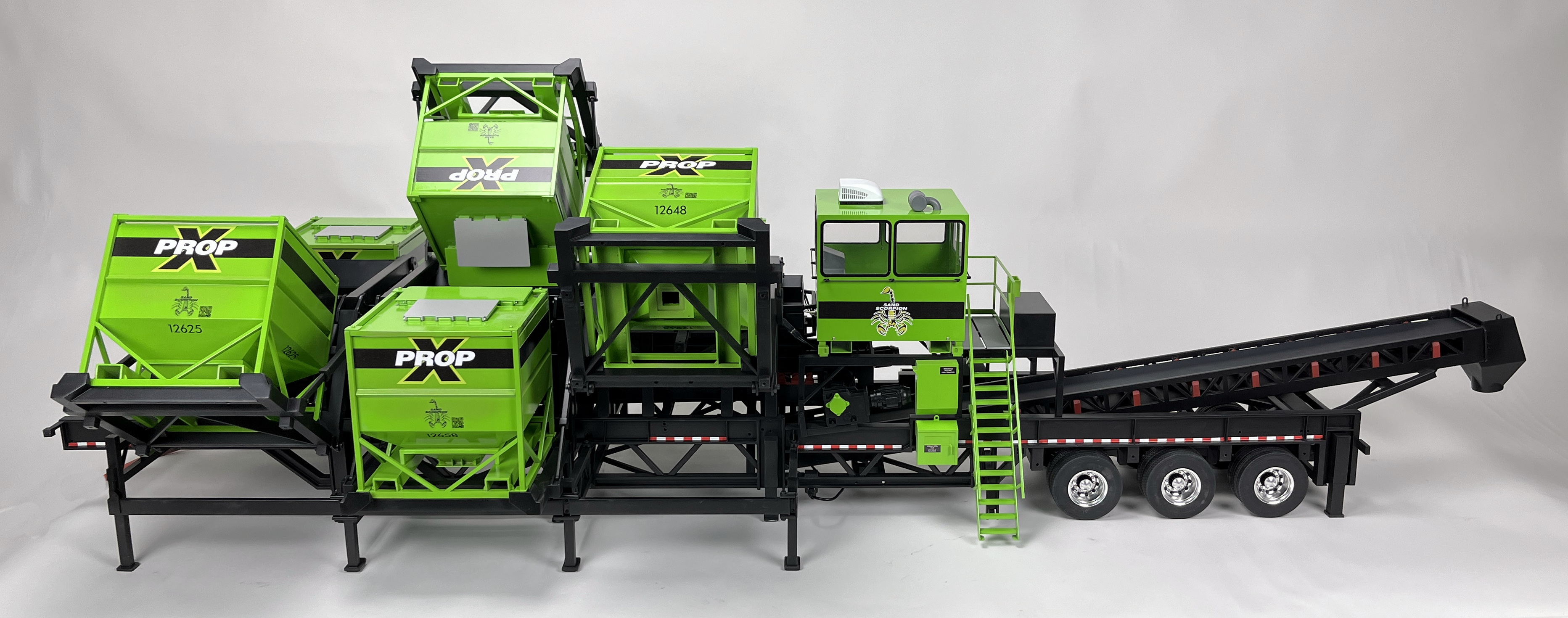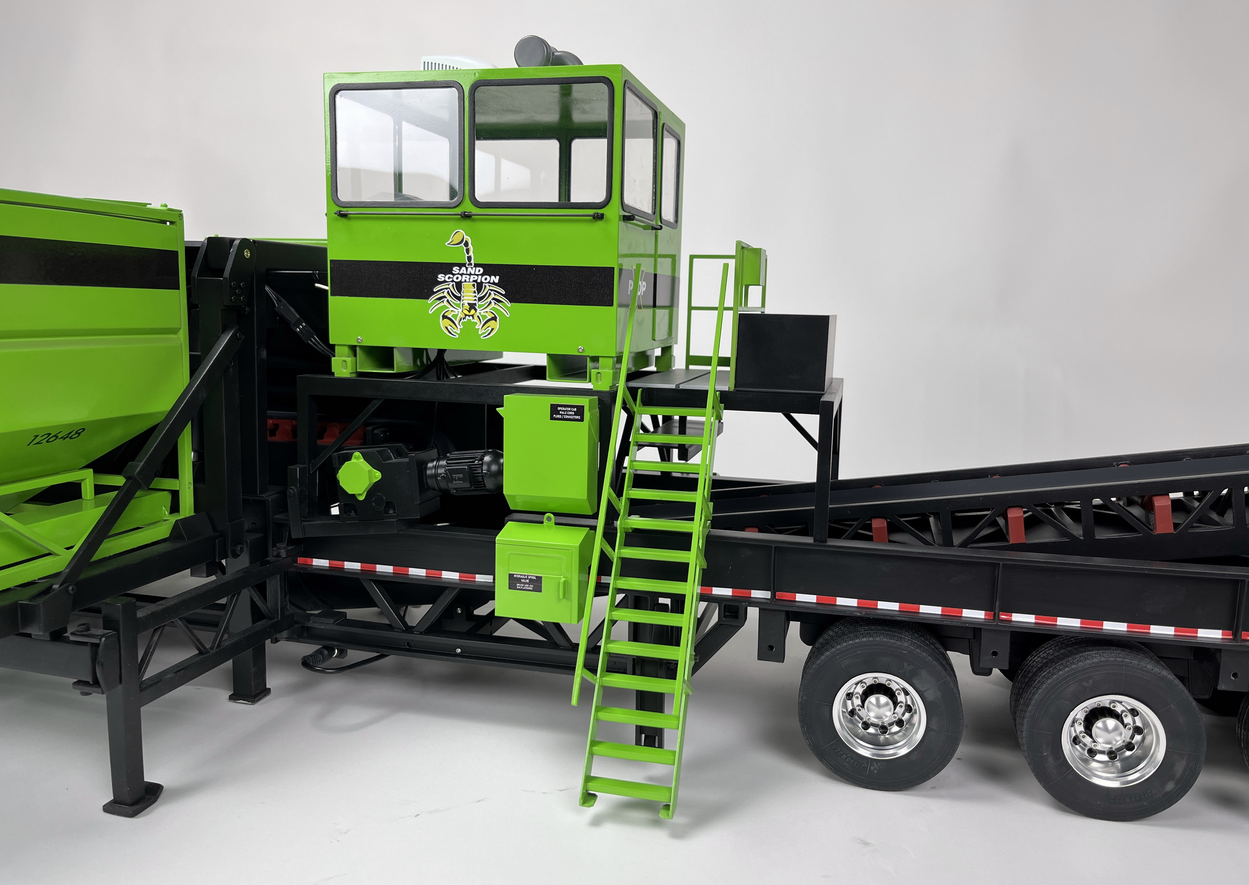 This amazing model is 6ft long and was a lot of fun for our team to build. Three of the bins are animated using linear servos and are programmed to dump at random intervals. The model was built with a variety of materials including sheet-metal and 3D printed plastic parts and mechanical movement features have bearings to help prevent wear.