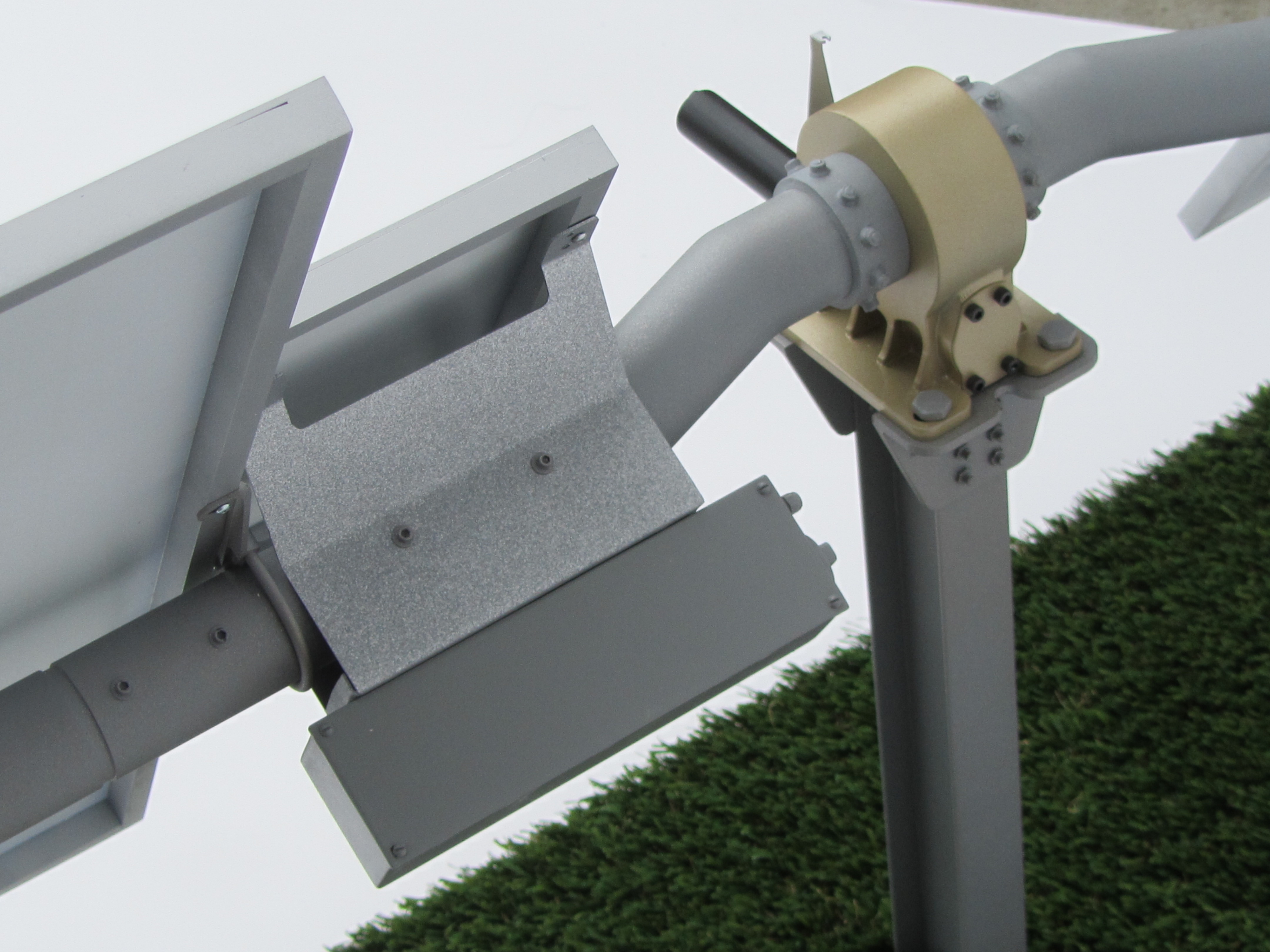 The second solar array model is a close up of the first model. This replica focuses on the center section of one pair of panels. The purpose of the blown up section of the model is to feature the gear box and motor area of our client's product.The materials used on this model are aluminum, ABS, brass and acrylic.