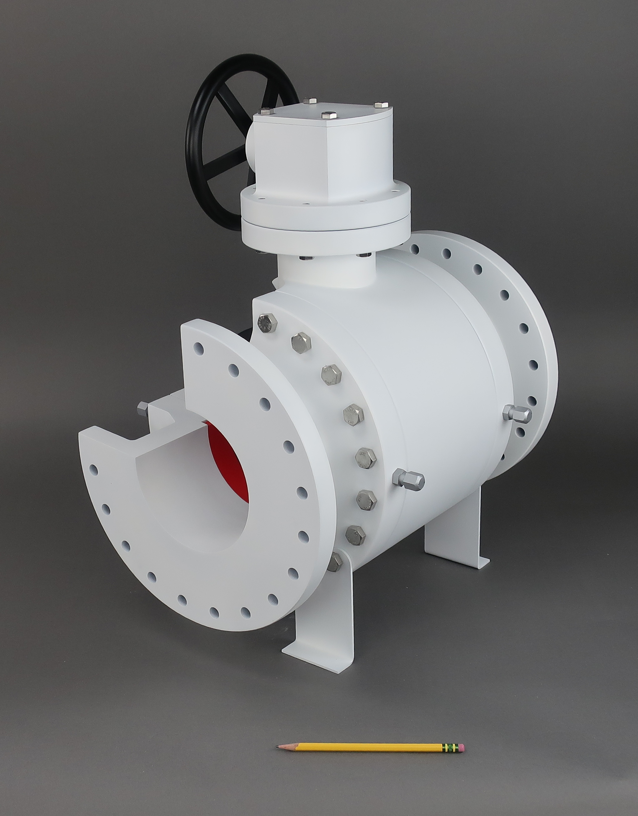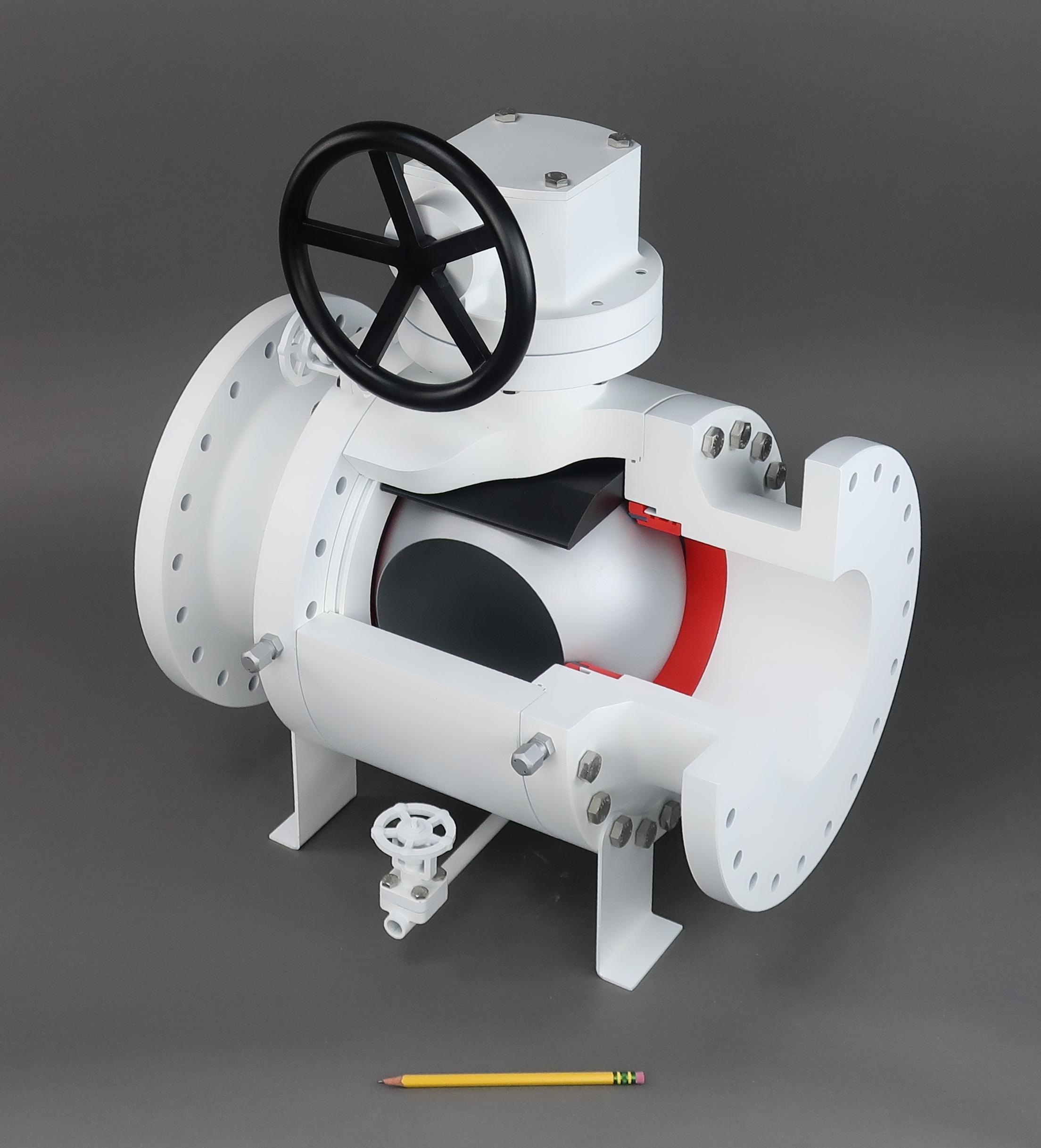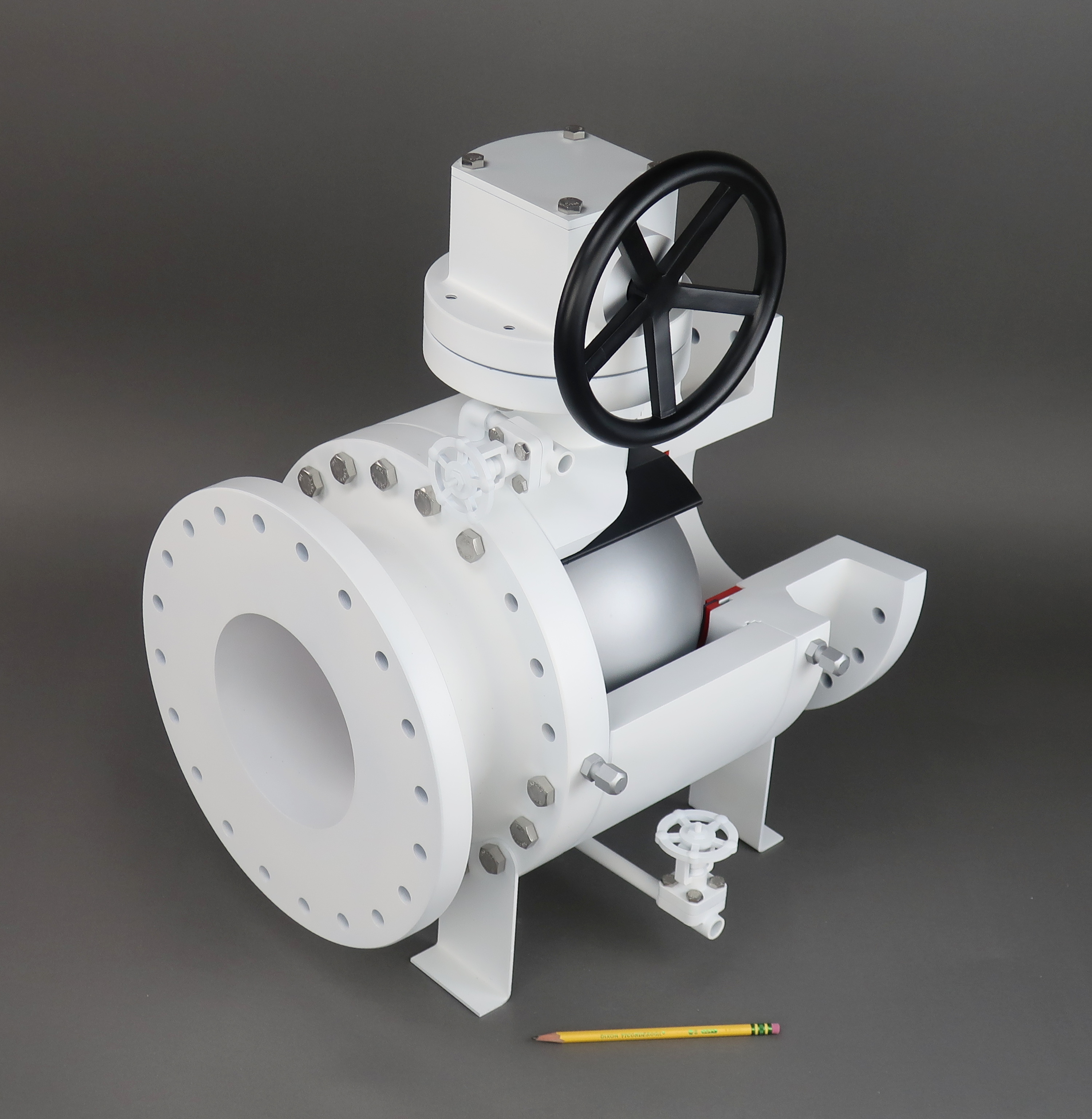 This 6" diameter trunnion ball valve model was designed for training personnel on the repair and maintenance of these valves. The ball rotates when the wheel is turned, all of the grease ports are represented and the seals are represented.